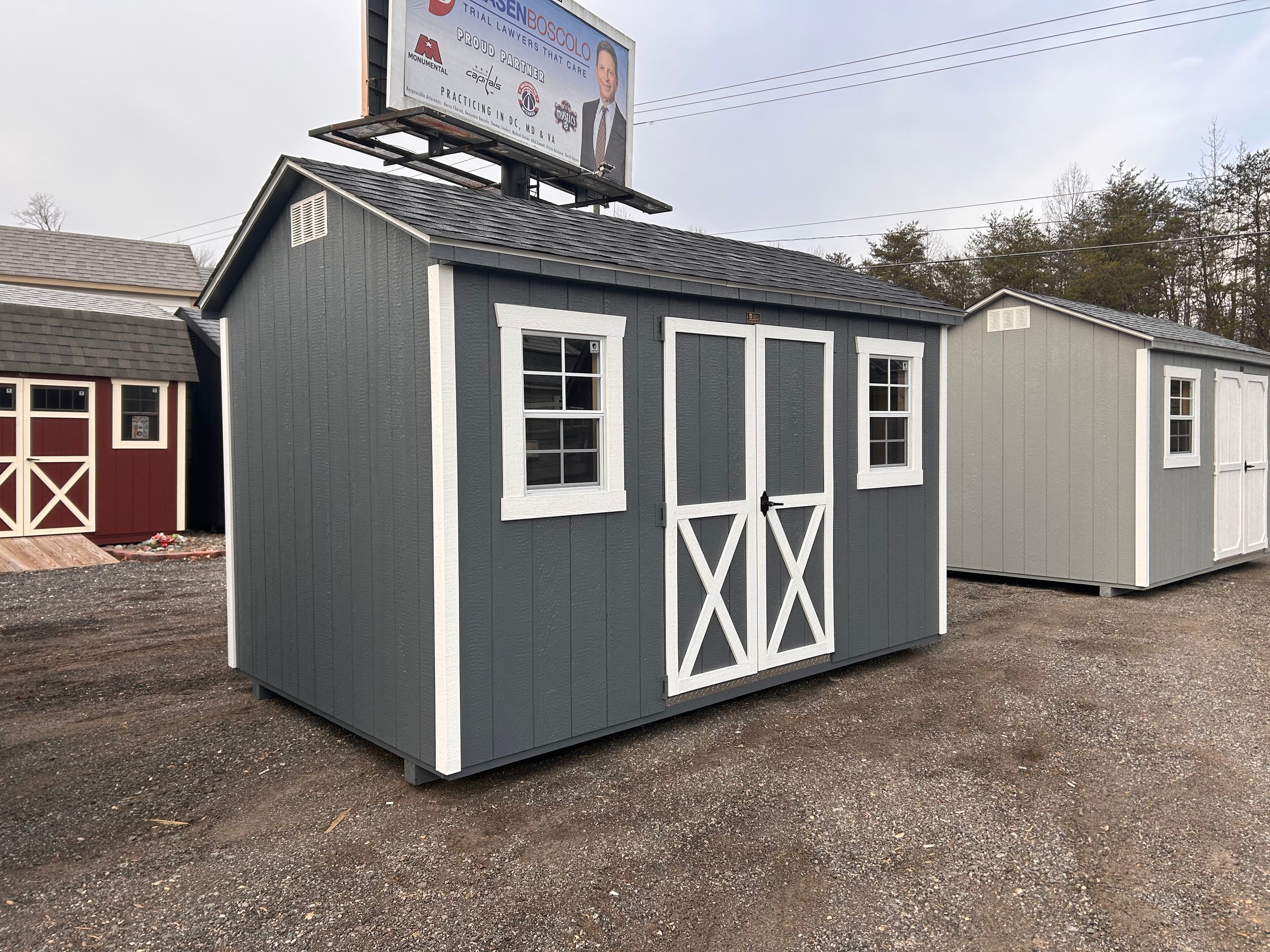 The 8×12 A-Frame offers a balanced blend of durability, efficiency, and modern curb appeal. Finished with LP SmartPanel siding in Dark Gray, complemented by white trim and a charcoal architectural shingle roof, this structure fits seamlessly into residential or backyard settings. Built with 2×4 wall and roof framing at 16 inches on center, LP Tech Shield roof sheeting, LP ProStruct flooring, and pressure-treated floor joists, it’s designed for long-term performance. Two doors and two windows provide accessibility and natural light, while three 16″ wood shelves add immediate organization and functional storage.