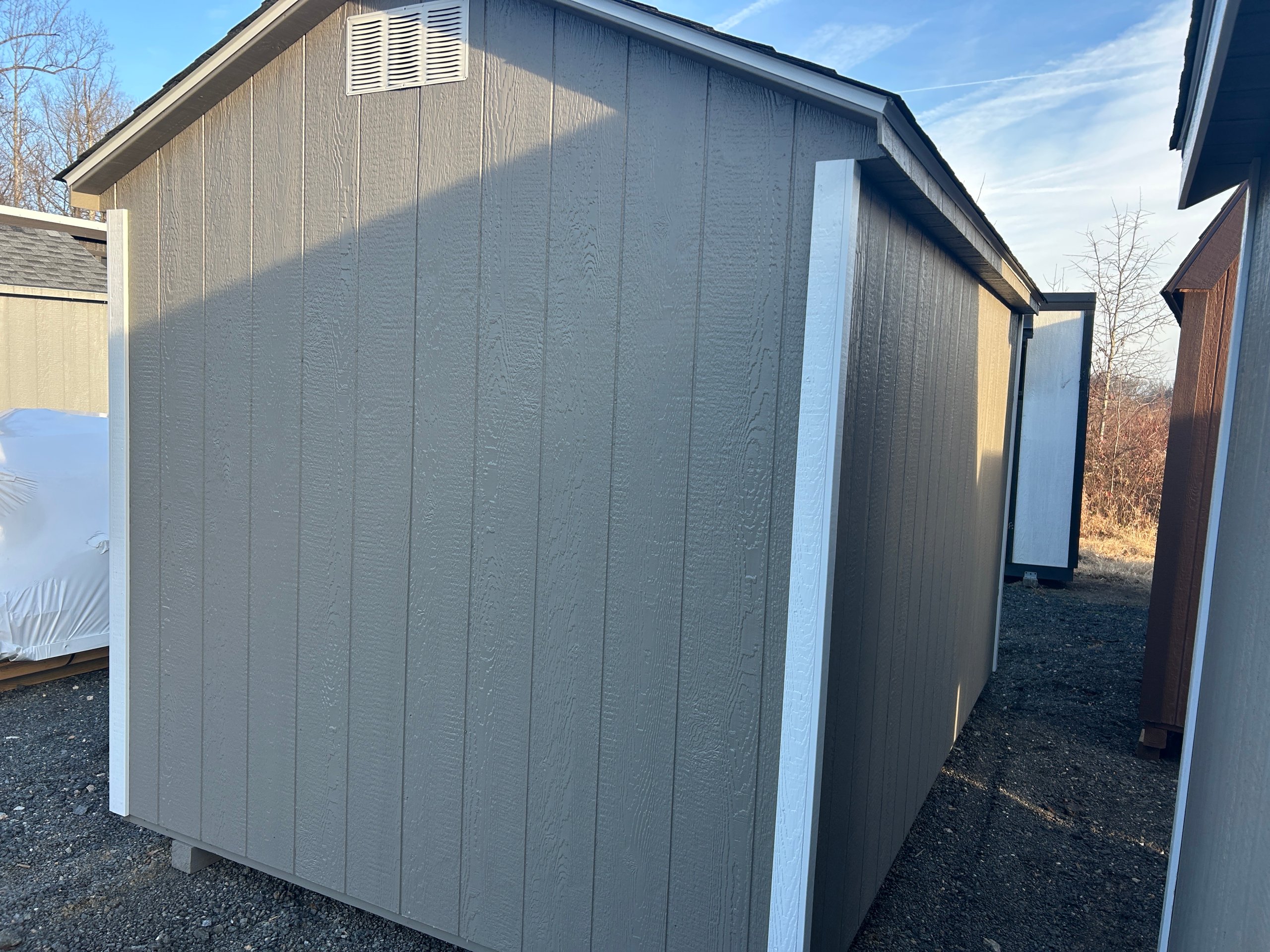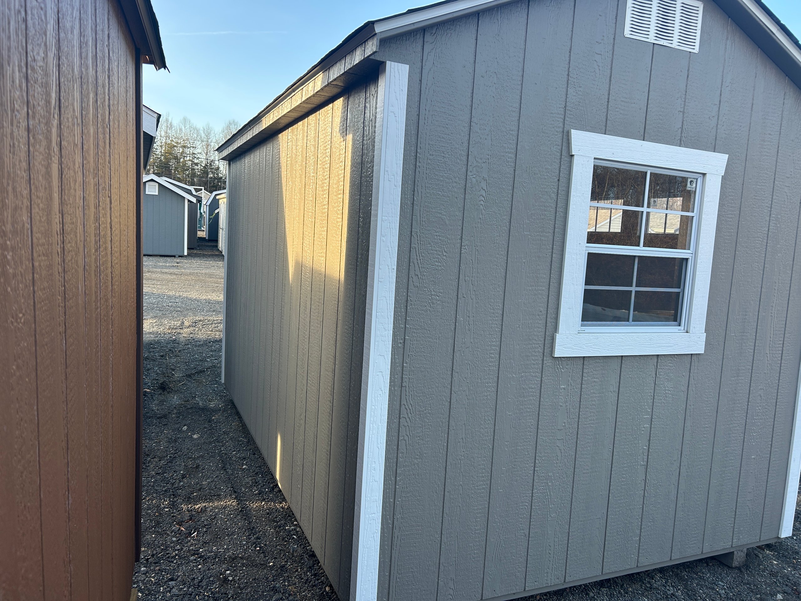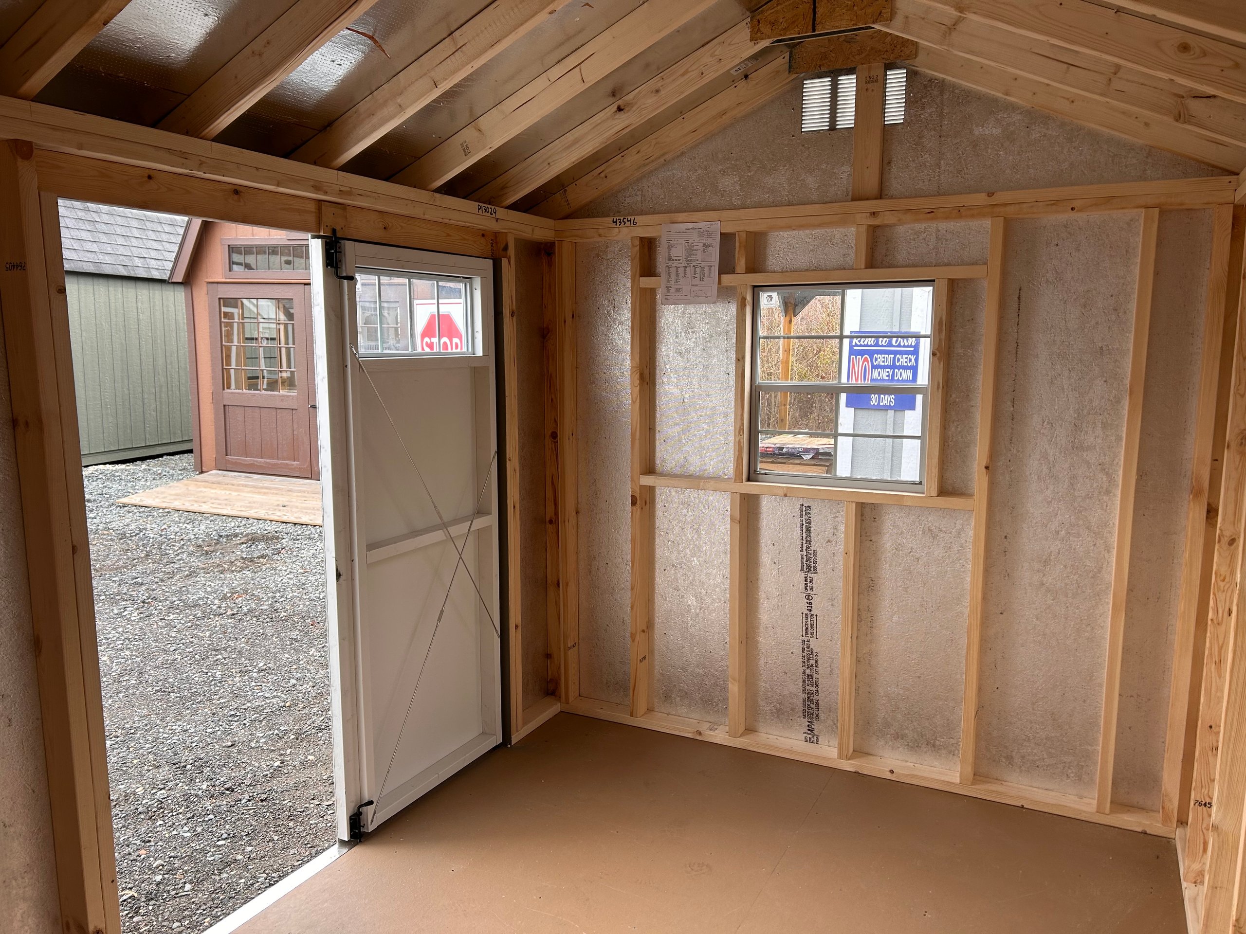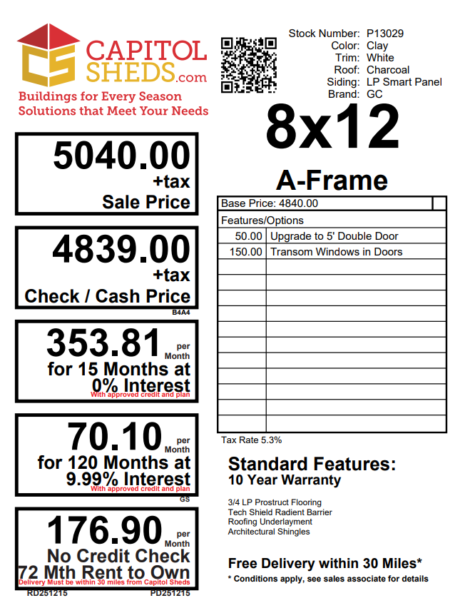 The 8×12 A-Frame delivers compact efficiency with a clean, classic profile. Finished in LP SmartPanel siding with a warm Clay exterior, white trim, and a charcoal architectural shingle roof, this building offers strong curb appeal in a versatile footprint. Construction includes 2×4 wall and roof framing at 16 inches on center, LP Tech Shield roof sheeting, LP ProStruct flooring, and pressure-treated floor joists for lasting durability. Functional upgrades such as 5′ wood double doors with transom windows enhance access and natural light, making this A-Frame ideal for storage, hobbies, or everyday organization.