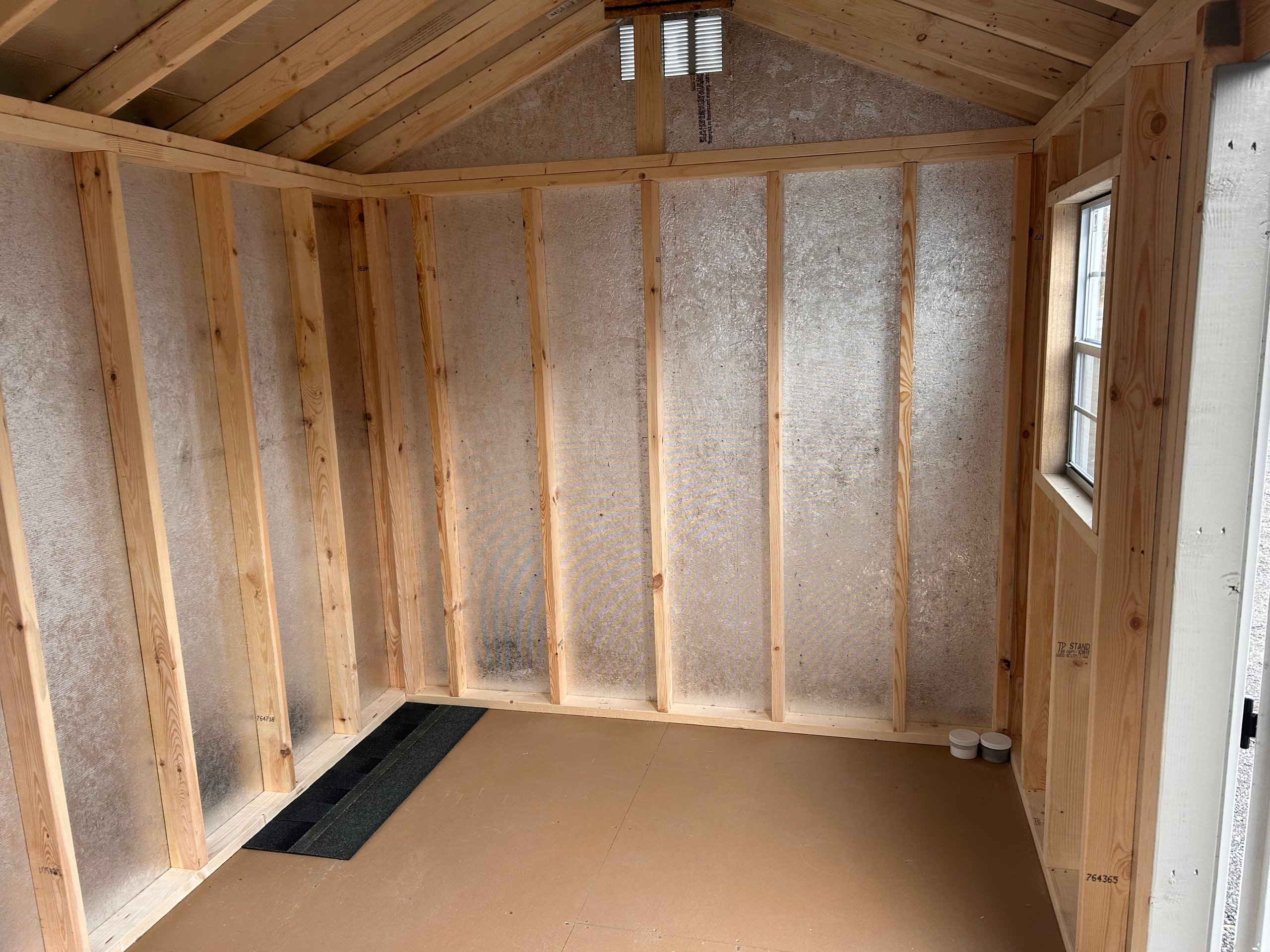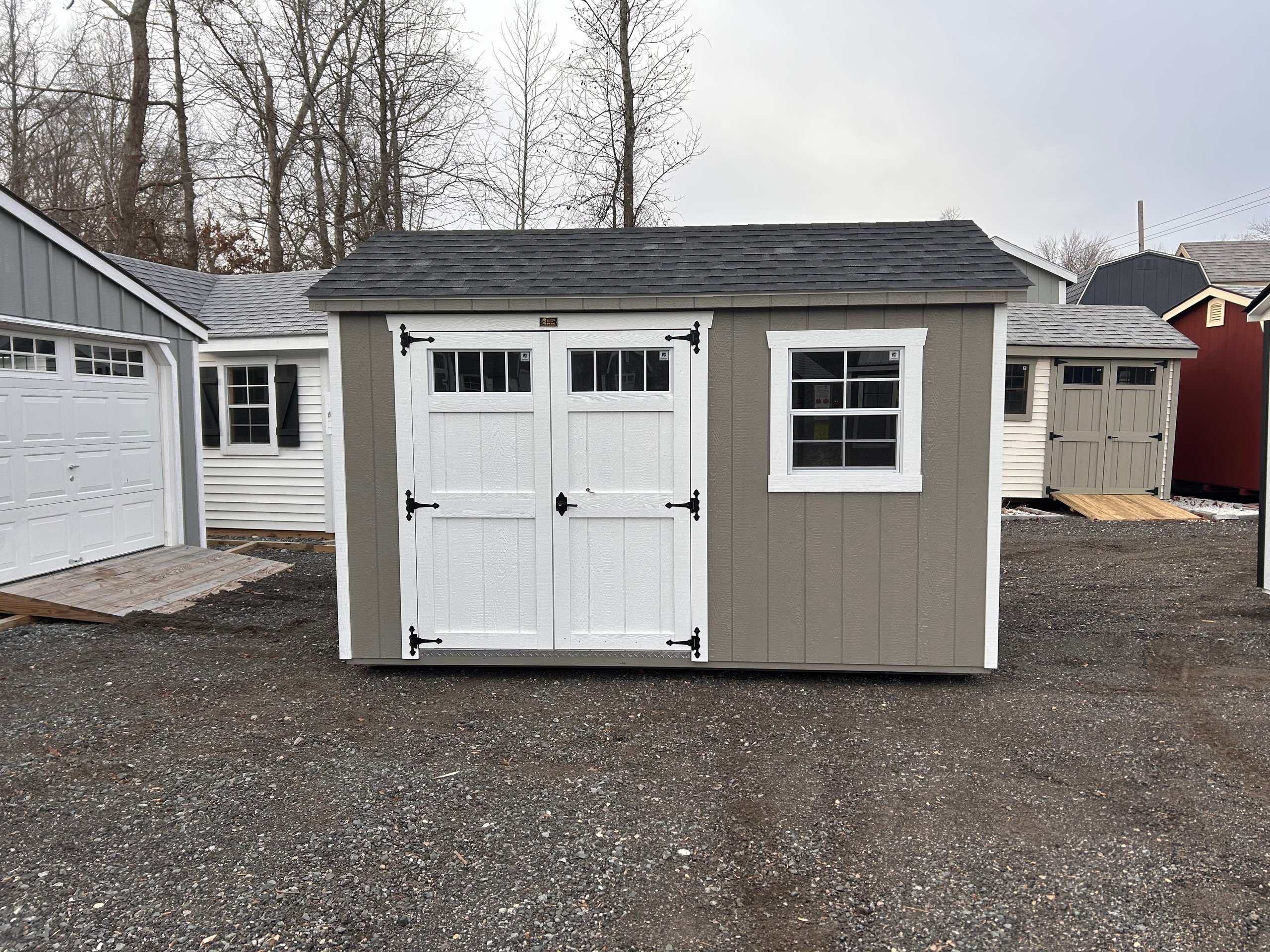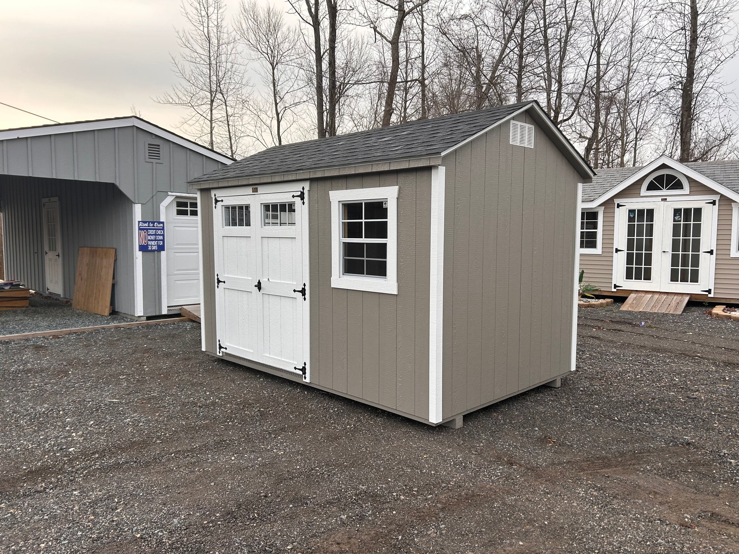 The 8×12 A-Frame delivers compact efficiency with a clean, classic profile. Finished in LP SmartPanel siding with a warm Clay exterior, white trim, and a charcoal architectural shingle roof, this building offers strong curb appeal in a versatile footprint. Construction includes 2×4 wall and roof framing at 16 inches on center, LP Tech Shield roof sheeting, LP ProStruct flooring, and pressure-treated floor joists for lasting durability. Functional upgrades such as 5′ wood double doors with transom windows enhance access and natural light, making this A-Frame ideal for storage, hobbies, or everyday organization.