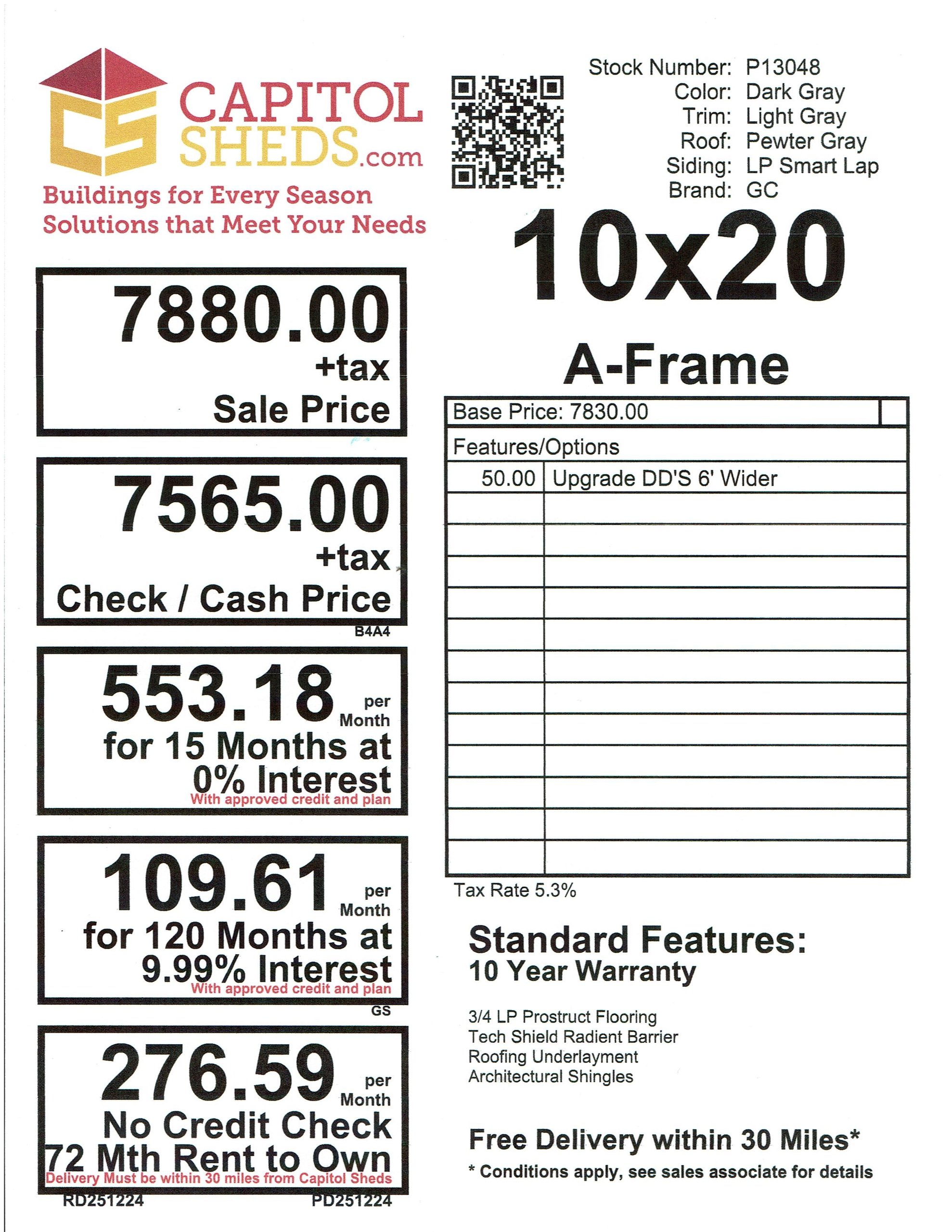 This 10×20 A-Frame shed combines generous storage space with clean, modern styling. Built with LP Smart Lap siding in Dark Gray and accented by Light Gray trim, it delivers a sharp, contemporary appearance topped with a Pewter Gray roof. Two windows provide natural light to brighten the interior, while the upgraded 6′ wide double doors allow easy access for larger equipment, tools, or recreational items. Finished with durable 3/4″ LP ProStruct flooring, this shed is designed for long-lasting strength, functionality, and everyday convenience.