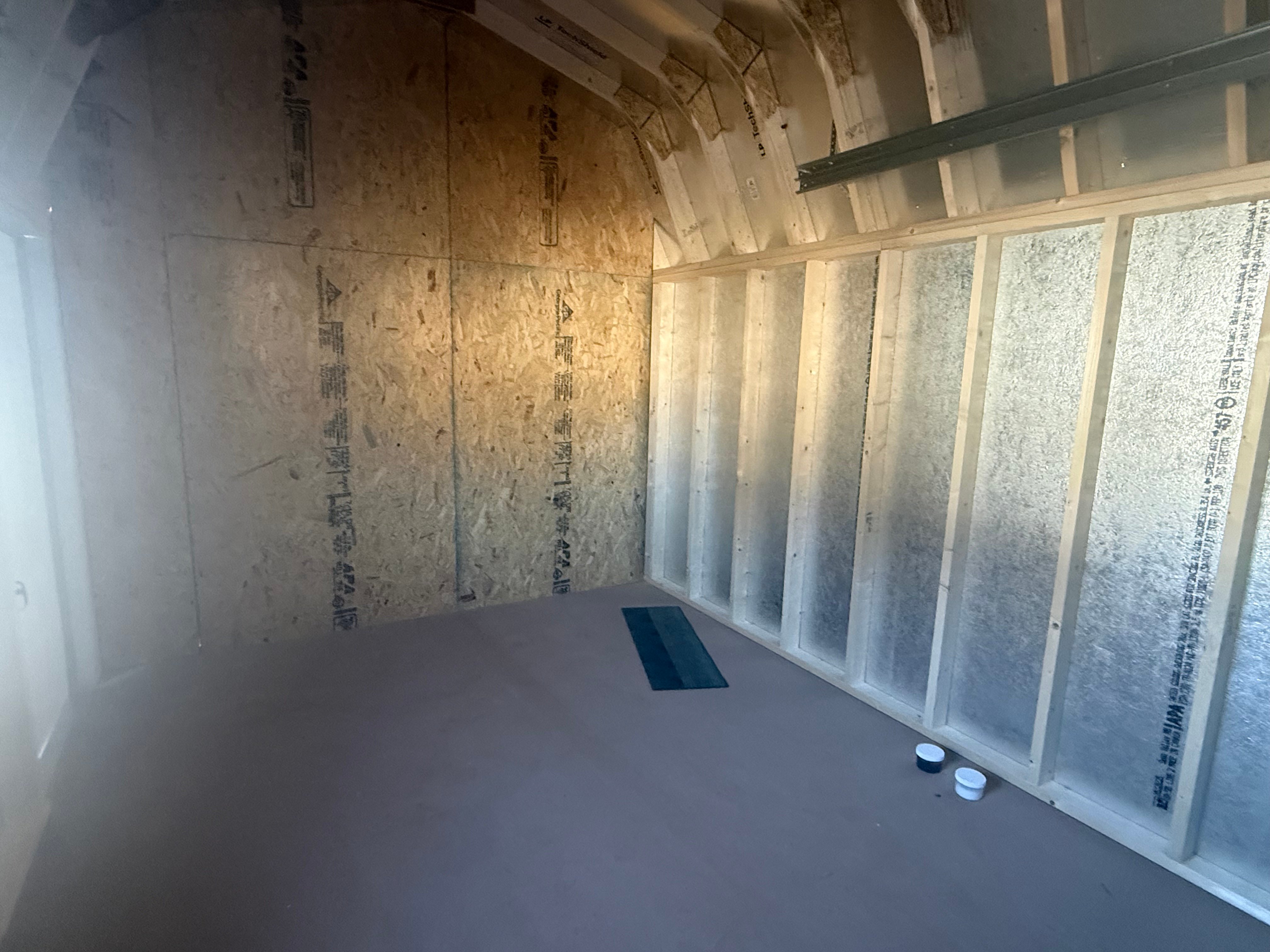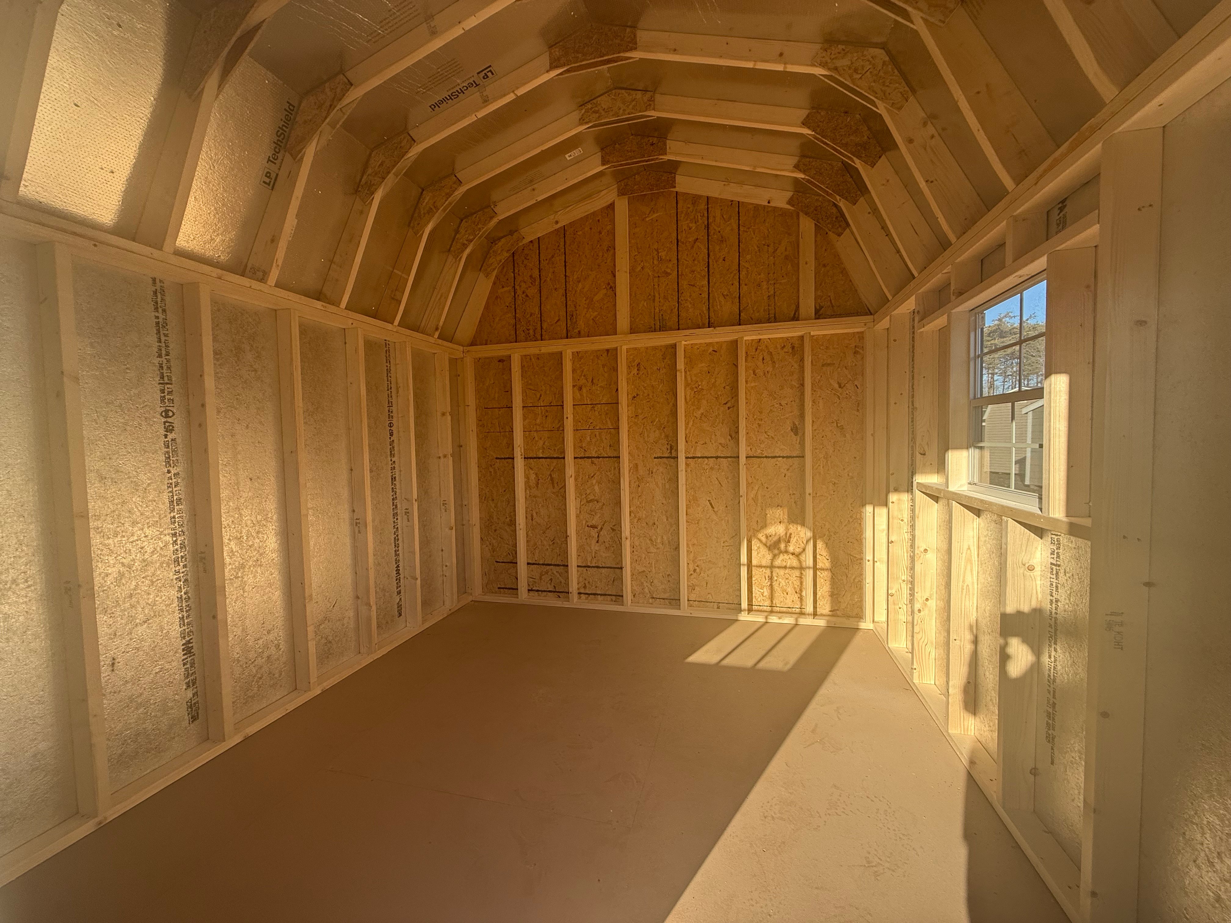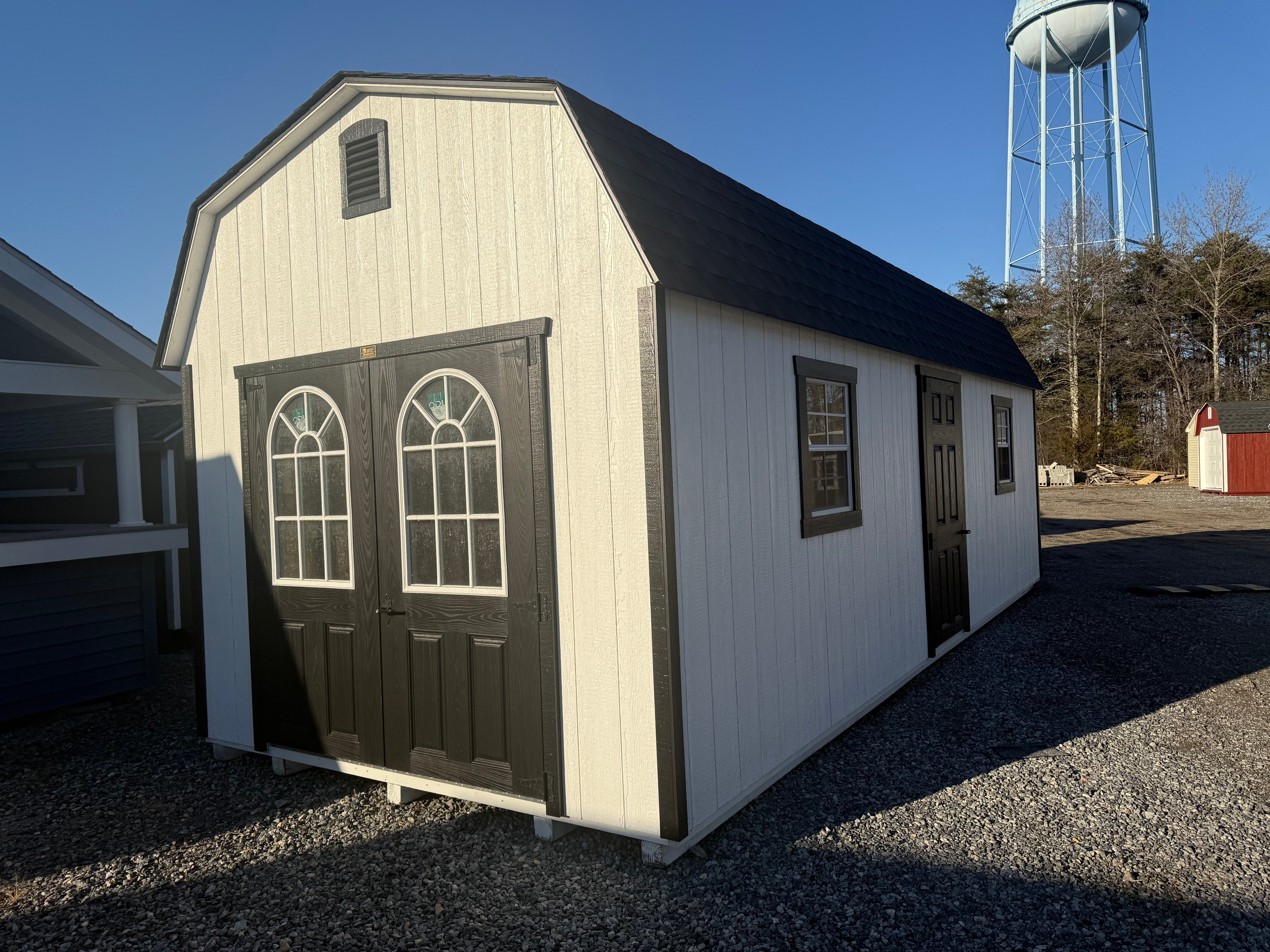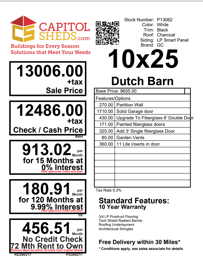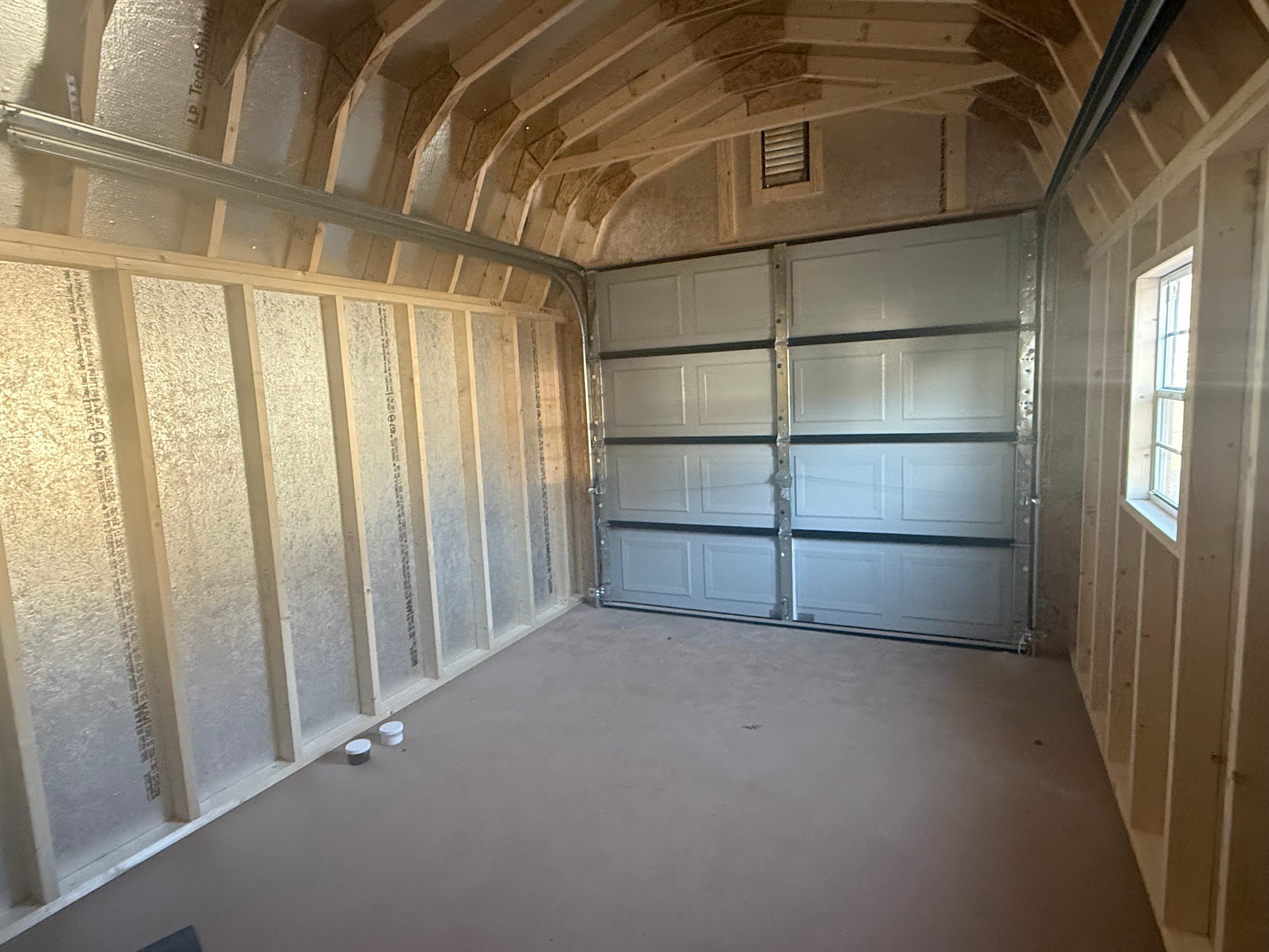 This Amish-built 10×25 Dutch Barn Garage shed delivers bold style and premium functionality with a striking White finish and Black trim and roof. Built with durable LP Smart Panel siding, it features an extra double door, a 9-light fiberglass door, a solid fiberglass door, and a garage door for easy access and natural light. the interior, while a partition wall adds organized space. Expert craftsmanship ensures a strong, versatile structure perfect for storage, work, or garage use.