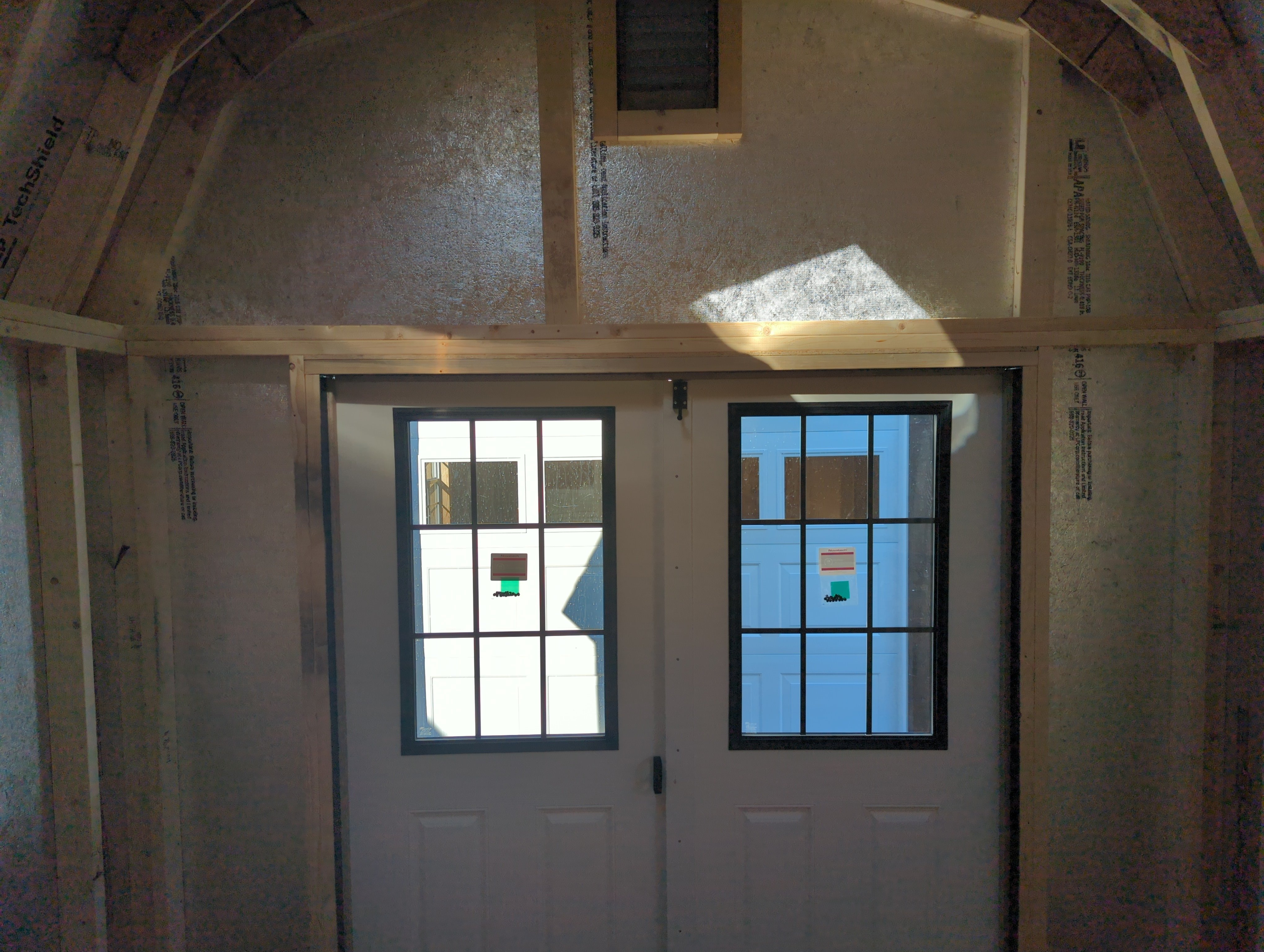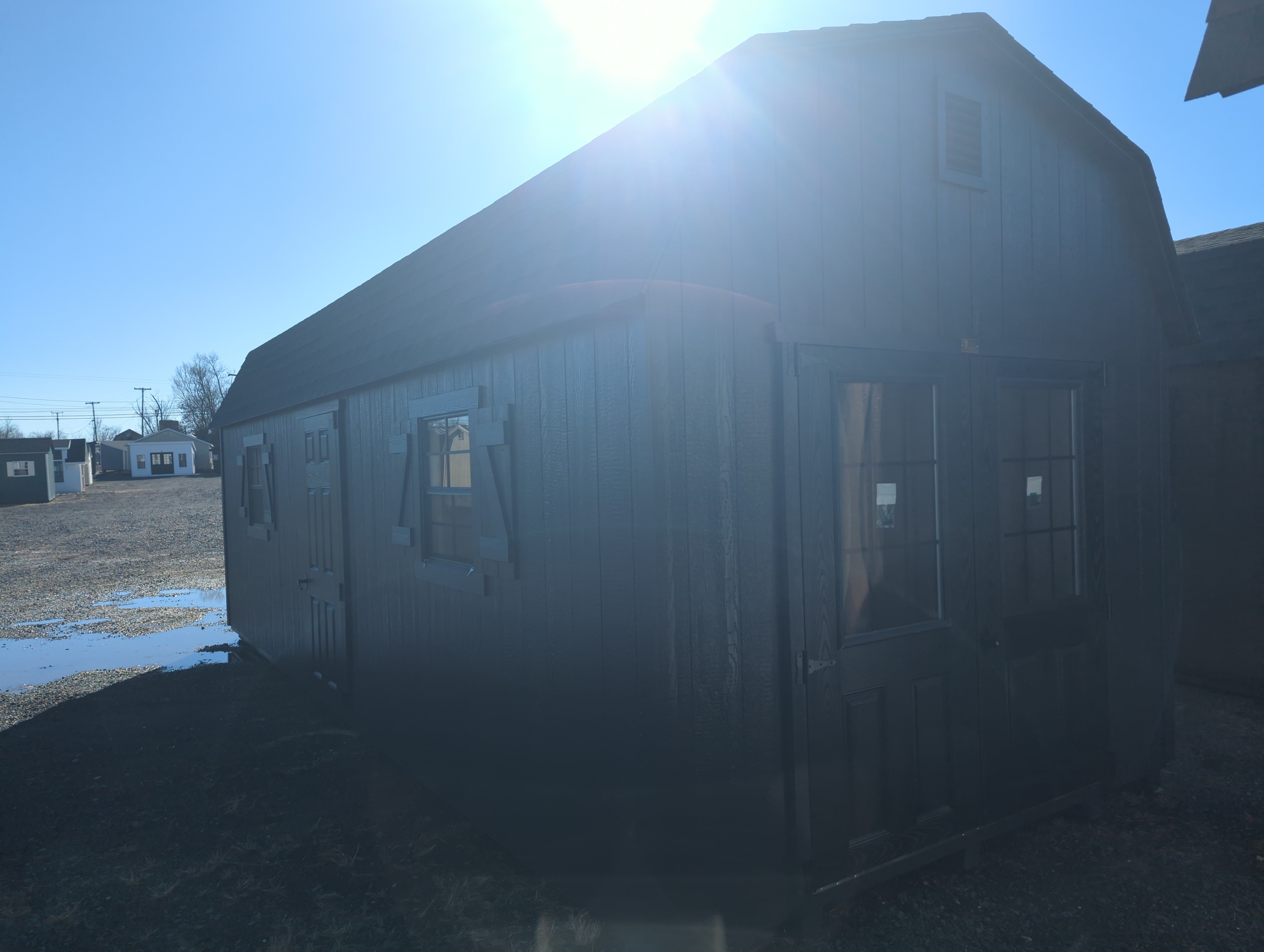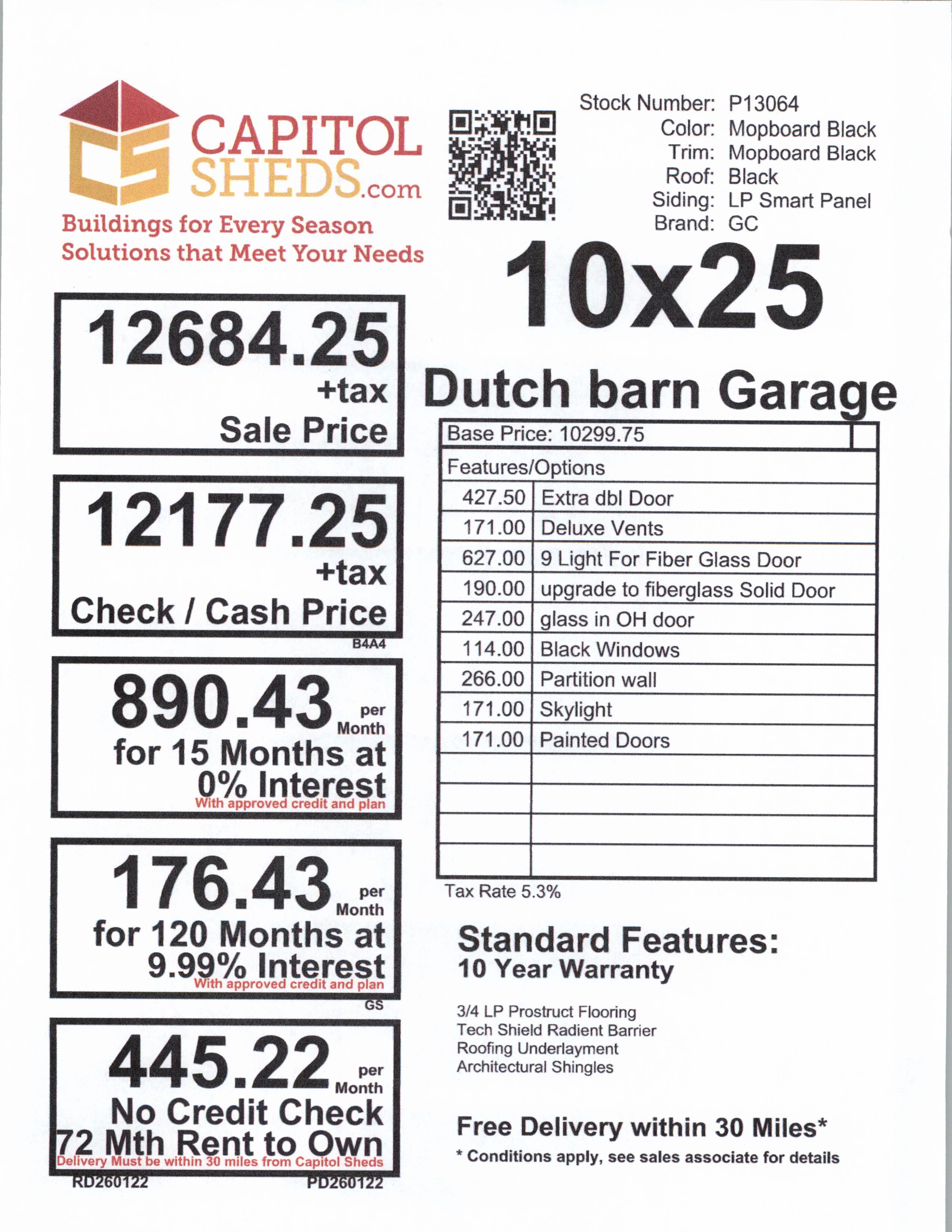 This Amish-built 10×25 Dutch Barn Garage shed delivers bold style and premium functionality with a striking Mopboard Black finish and matching trim and roof. Built with durable LP Smart Panel siding, it features an extra double door, a 9-light fiberglass door, a solid fiberglass door, and a garage door with glass for easy access and natural light. Black windows and a skylight brighten the interior, while a partition wall adds organized space. Expert craftsmanship ensures a strong, versatile structure perfect for storage, work, or garage use.