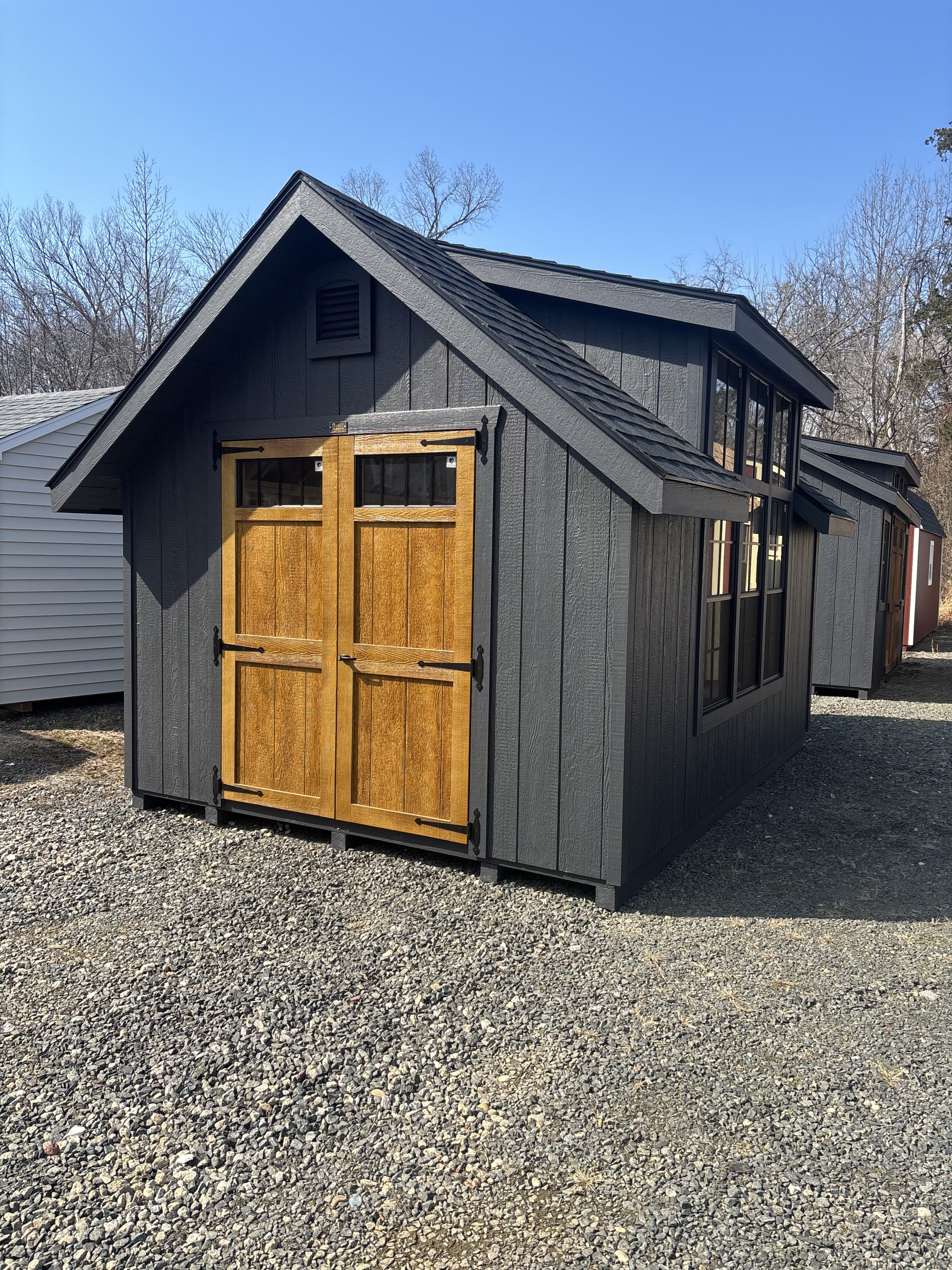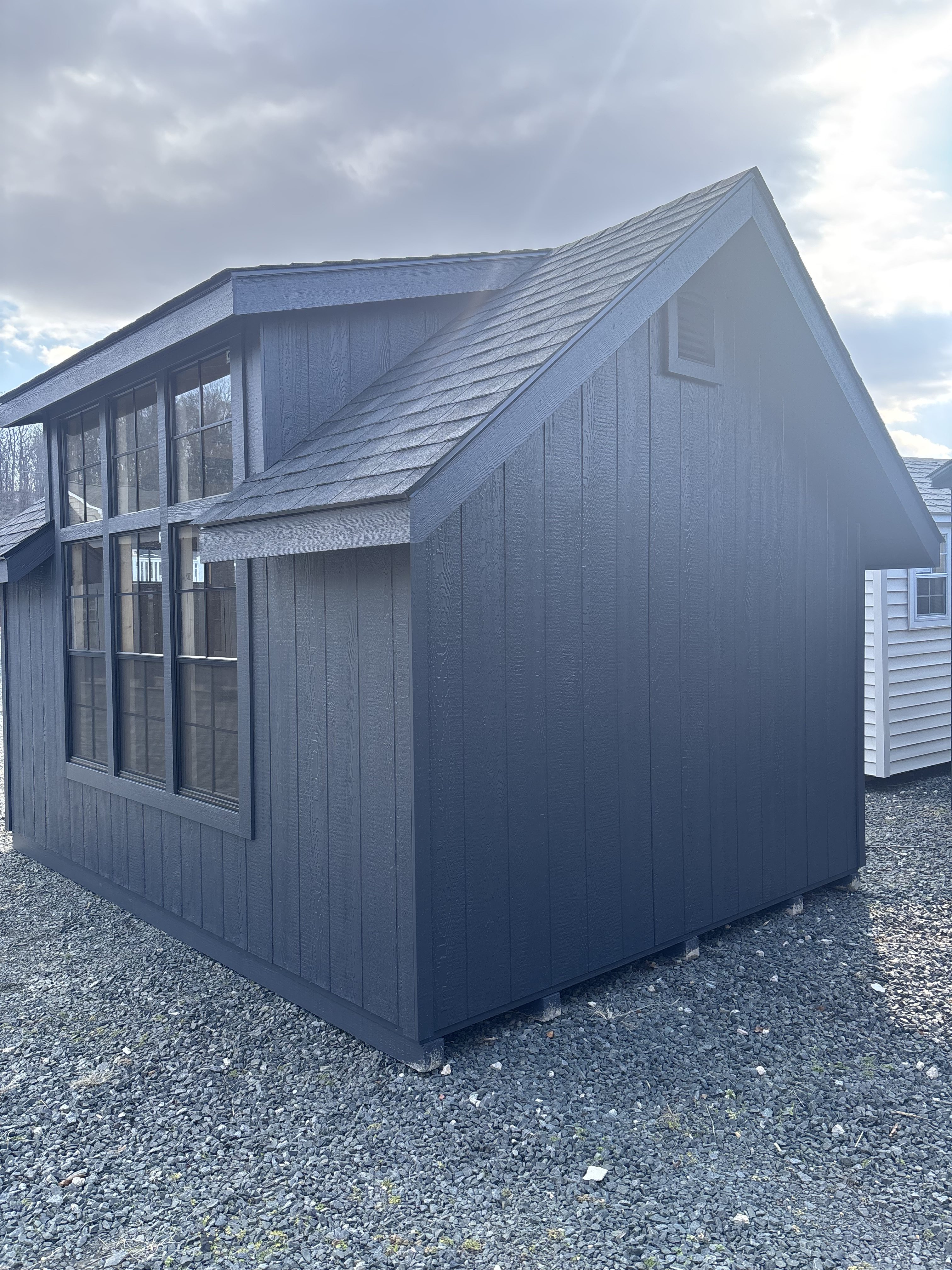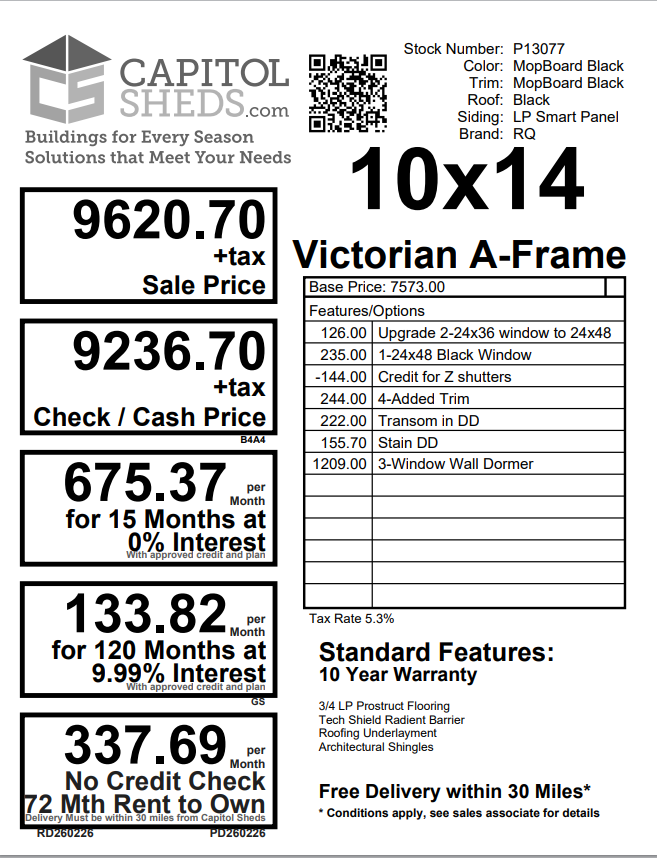 Style: Victorian A-Frame Size: 10×14 Color: Mopboard black Trim color: Mopboard black Roof color: Black Siding: LP Smart Panel Included Upgrades Upgraded windows to 24×48 added 1- 24×48 Window Transom in DD stained DD 3- Window wall dormer