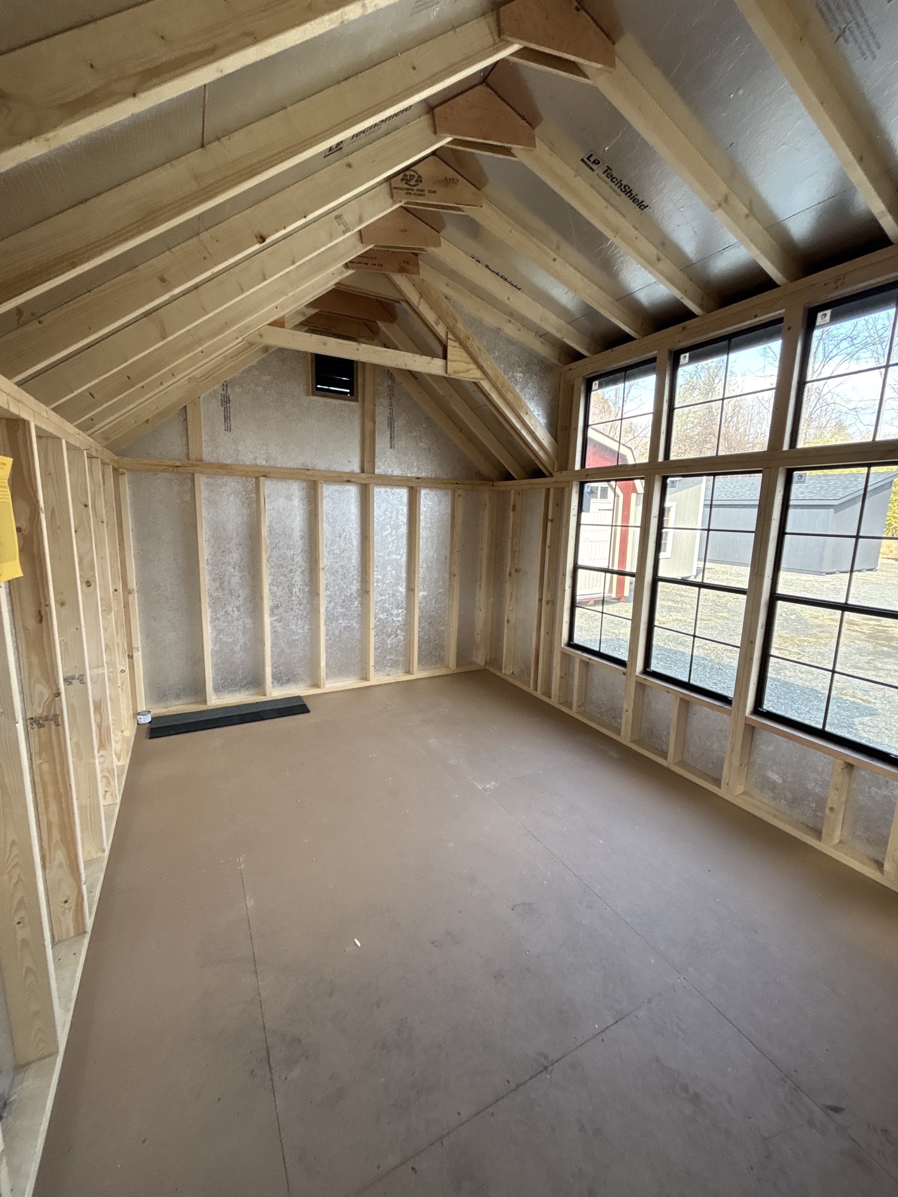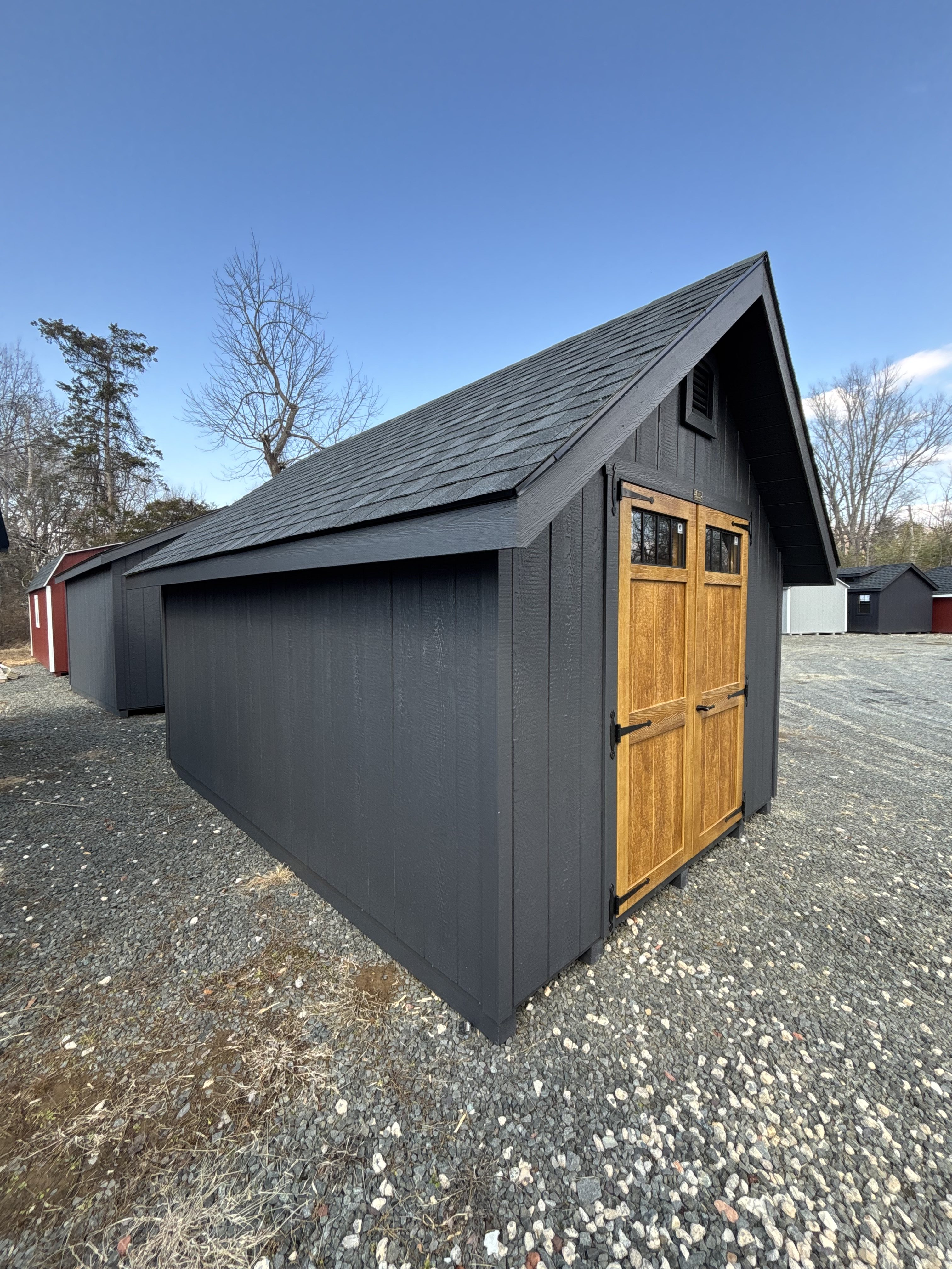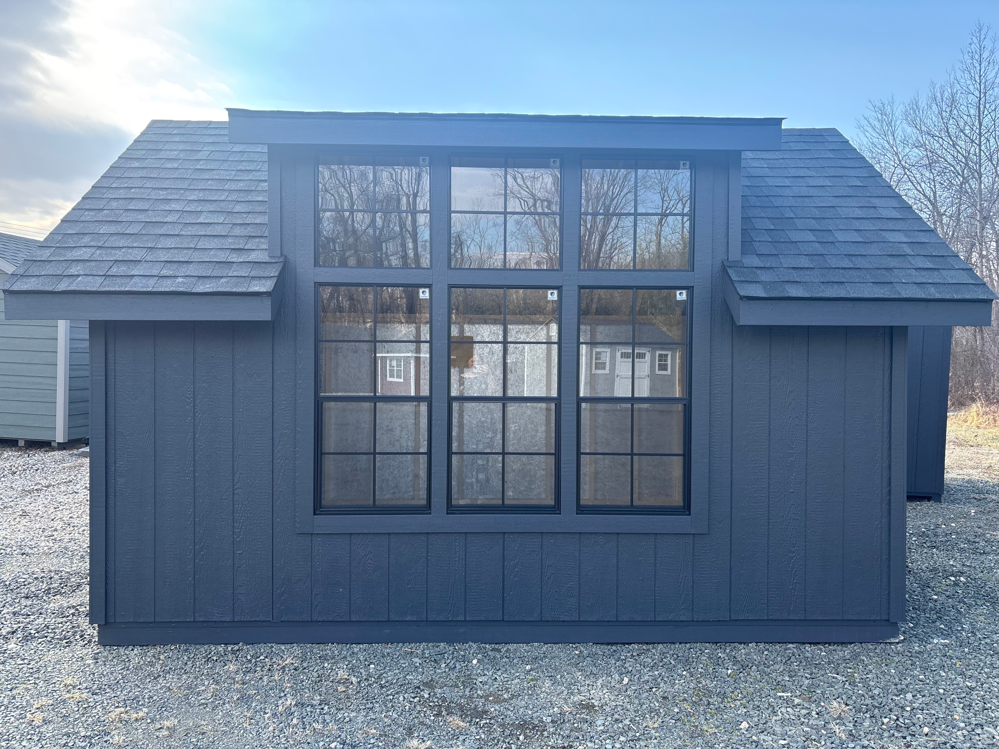 Style: Victorian A-Frame Size: 10×14 Color: Mopboard black Trim color: Mopboard black Roof color: Black Siding: LP Smart Panel Included Upgrades Upgraded windows to 24×48 added 1- 24×48 Window Transom in DD stained DD 3- Window wall dormer