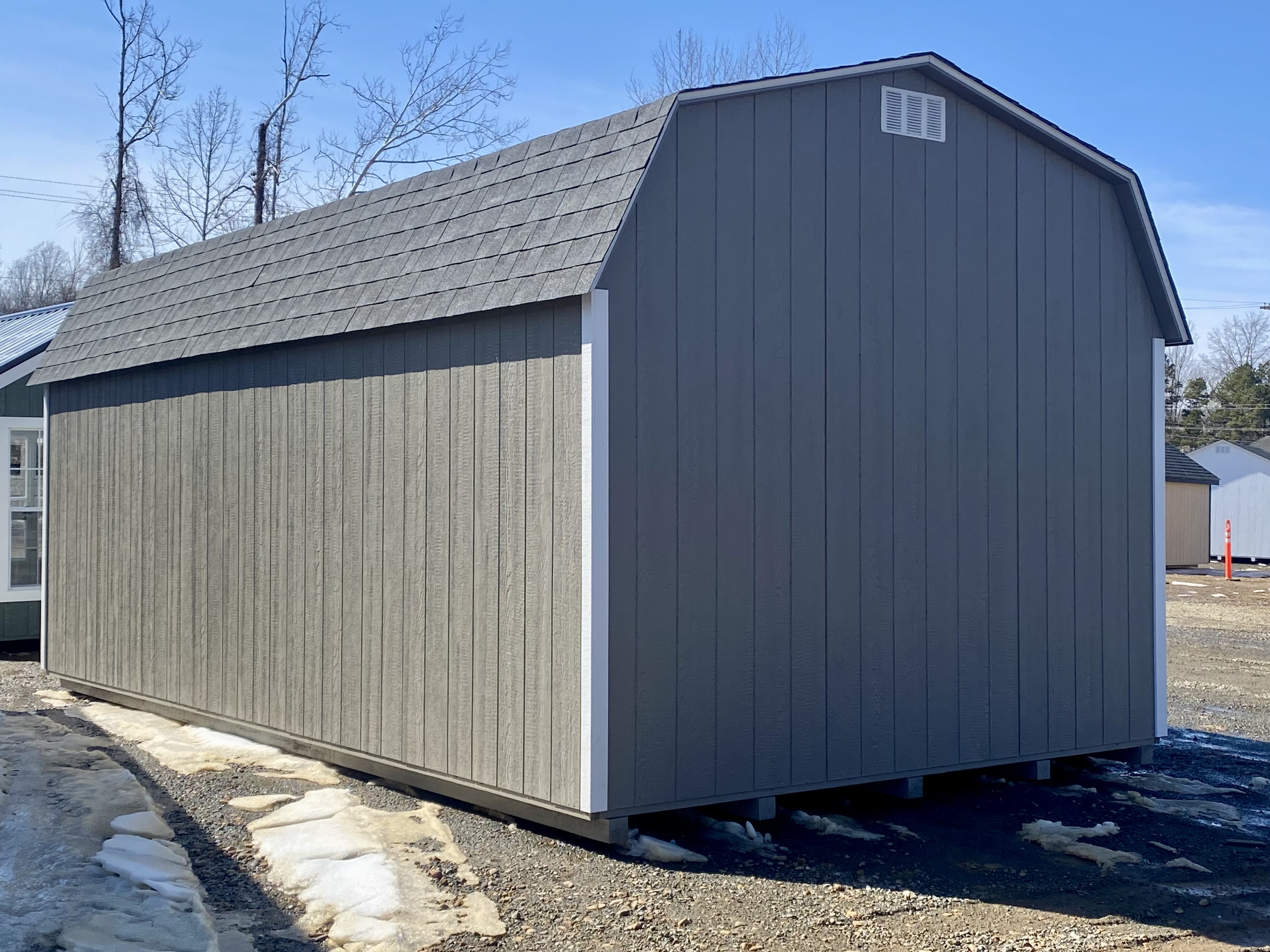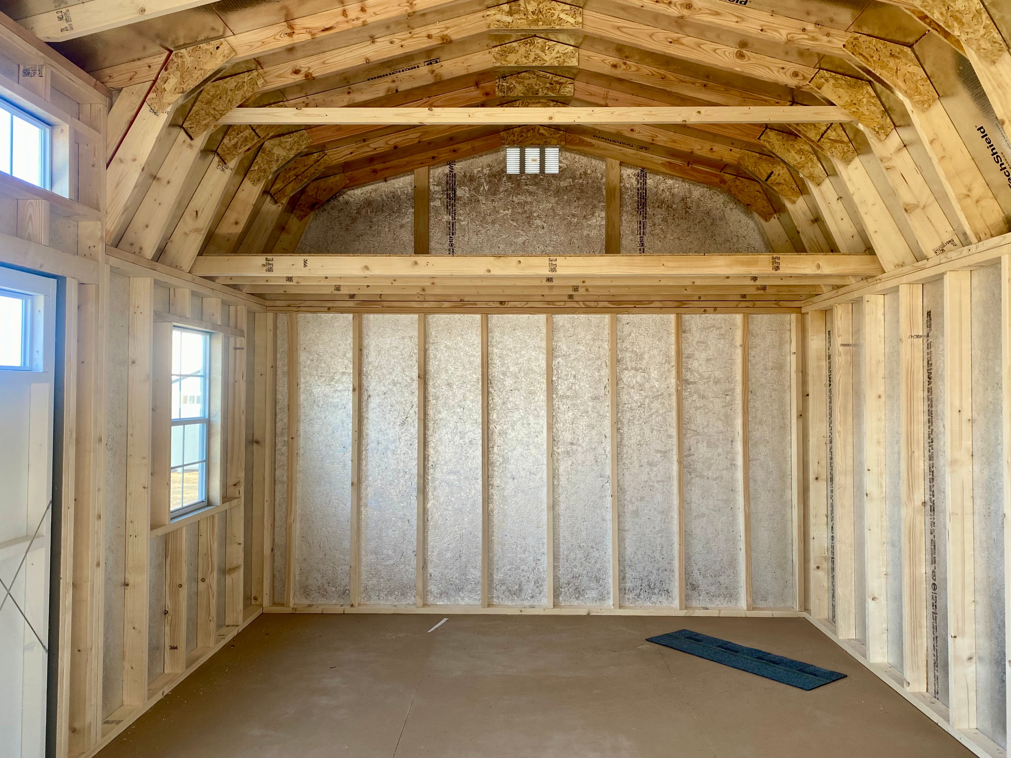 This 12×21’8″ Dutch Barn blends classic barn styling with upgraded features and heavy-duty construction. Finished in Clay LP Smart Panel siding with crisp white trim, it features a Pewter architectural shingle roof with LP Tech Shield sheeting for added protection. Built with 2×4 wall studs and rafters spaced 16 inches on center and reinforced with pressure-treated 2×4 floor joists 8 inches on center, it’s designed for long-term durability. Upgrades include a 9×7 overhead door with glass, transom garden doors, 24×36 windows, a two-window row dormer, and shutters—offering natural light, functionality, and timeless curb appeal.