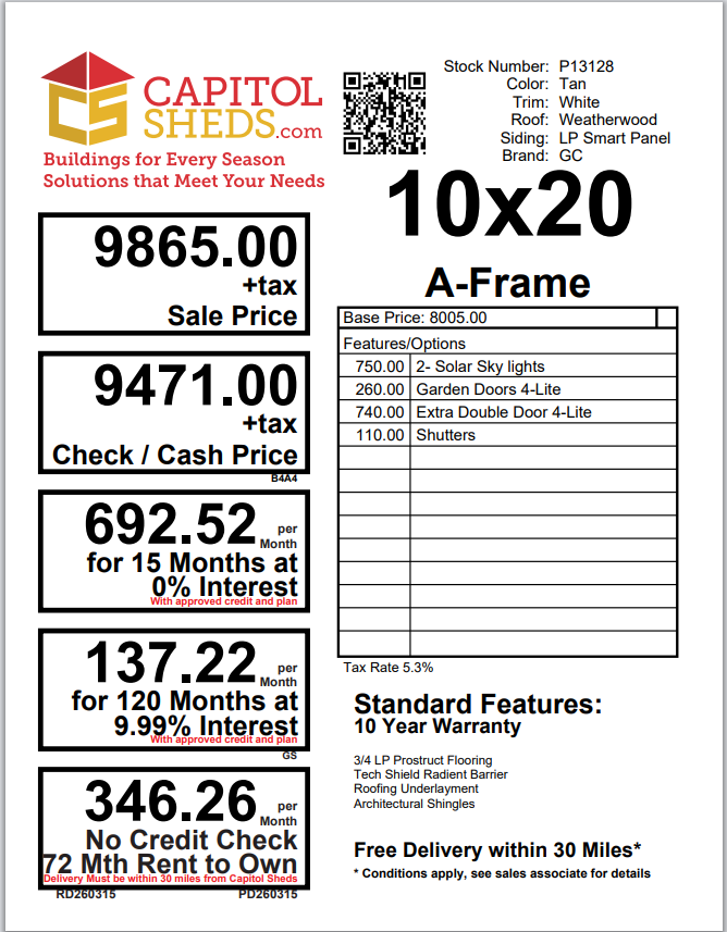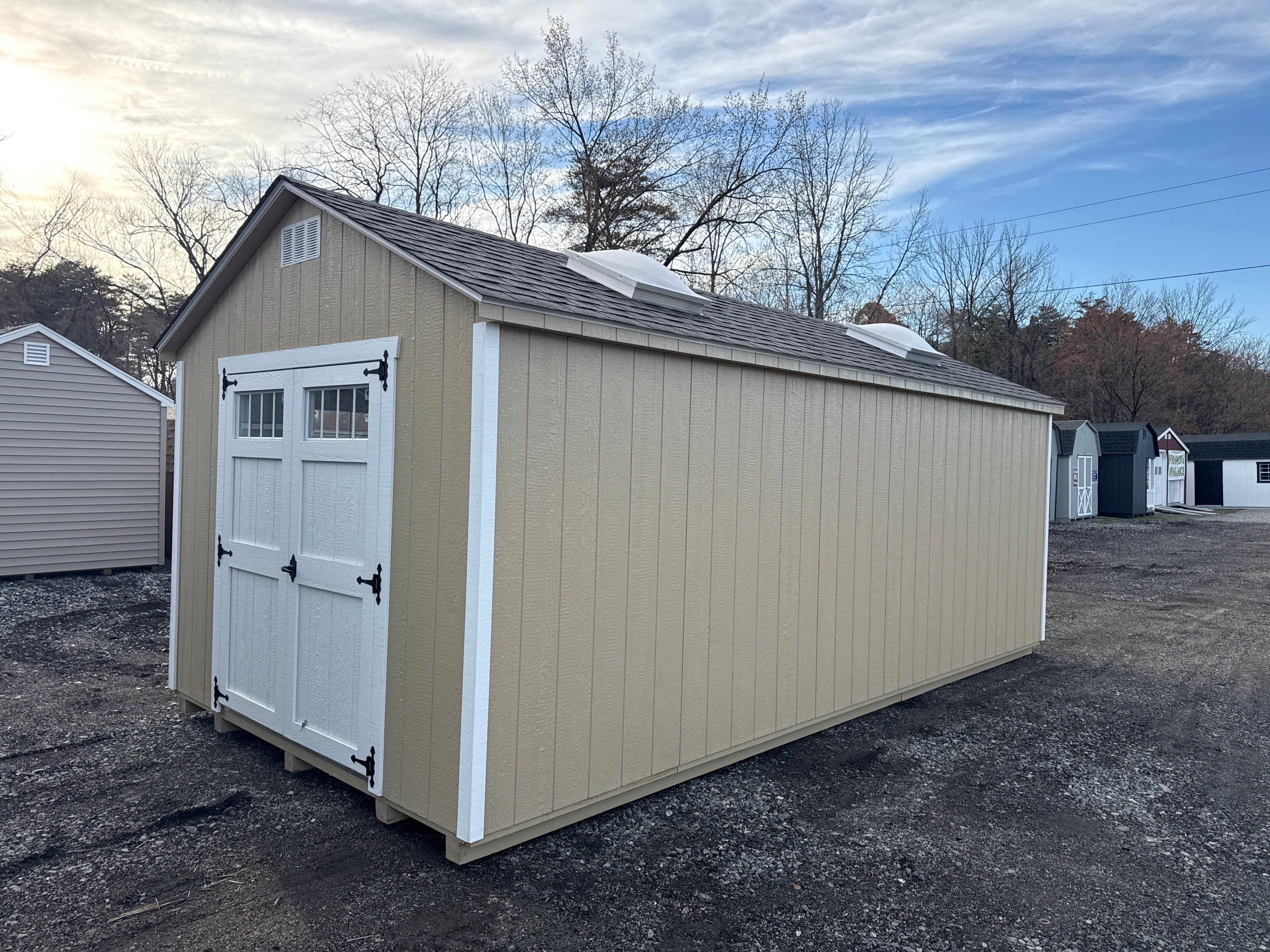 This 10×20 A-Frame shed blends timeless style with practical upgrades for everyday use. Finished in warm Tan LP Smart Panel siding with crisp white trim and a Weatherwood roof, it offers an inviting, traditional appearance. Two windows provide natural light, while upgraded double doors with transom windows enhance both accessibility and curb appeal. Inside, durable 3/4″ LP ProStruct flooring delivers long-lasting strength, and two 16″ deep shelves add convenient storage for tools, equipment, or seasonal items. Ideal for storage, hobbies, or a workshop, this A-Frame delivers dependable performance with refined details.