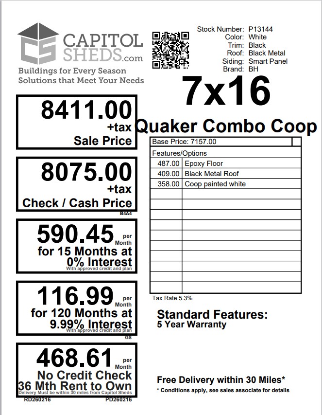 Upgrade your backyard with this beautifully crafted 7×16 Quaker-Style Chicken Coop, expertly Amish built for lasting quality and charm. Finished in crisp white with bold black trim and a sleek black metal roof, it delivers classic curb appeal with superior durability. Constructed with LP® Smart Panel siding for strength and weather resistance, this coop is built to stand the test of time. Inside, upgraded epoxy floors provide a clean, low-maintenance surface that’s easy to maintain. Spacious, sturdy, and designed with both function and style in mind—this premium coop is the perfect home for your flock.