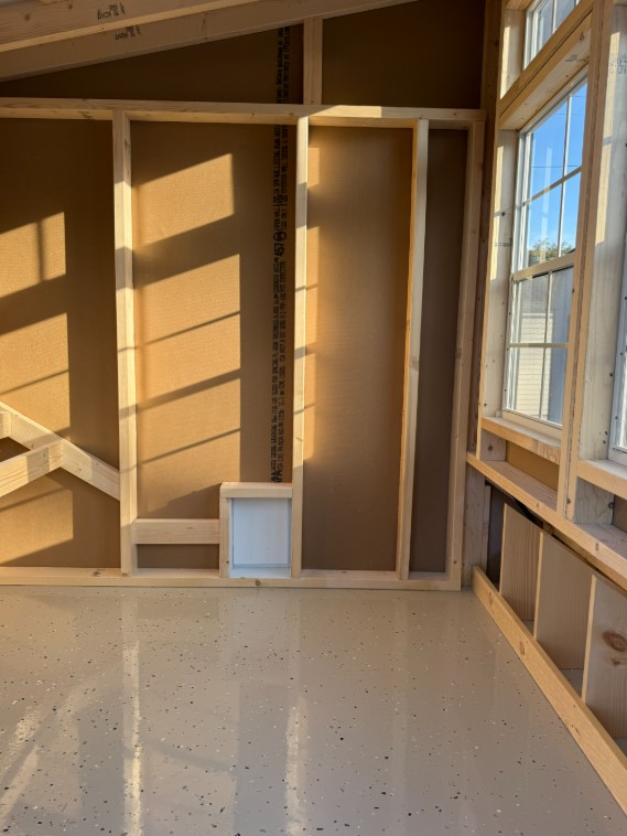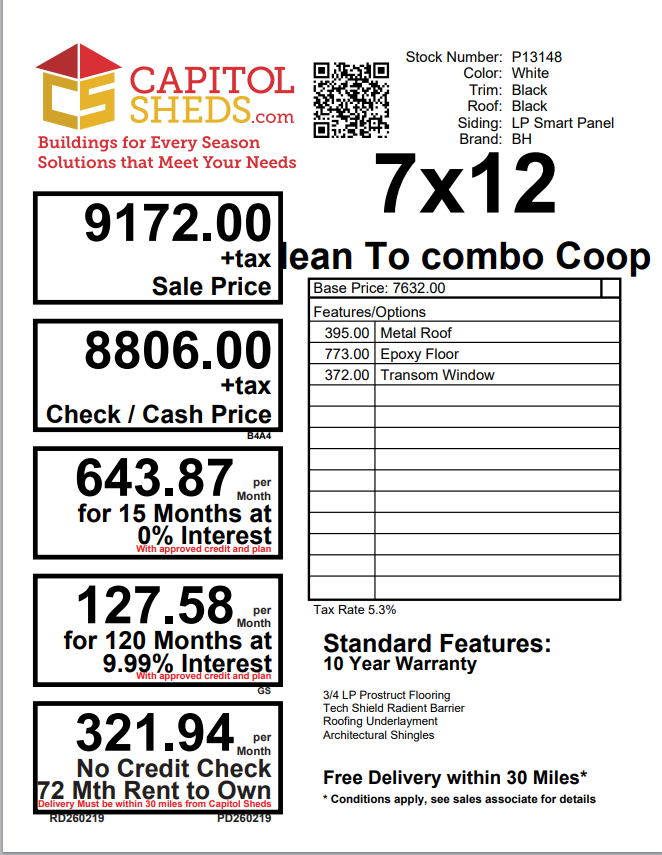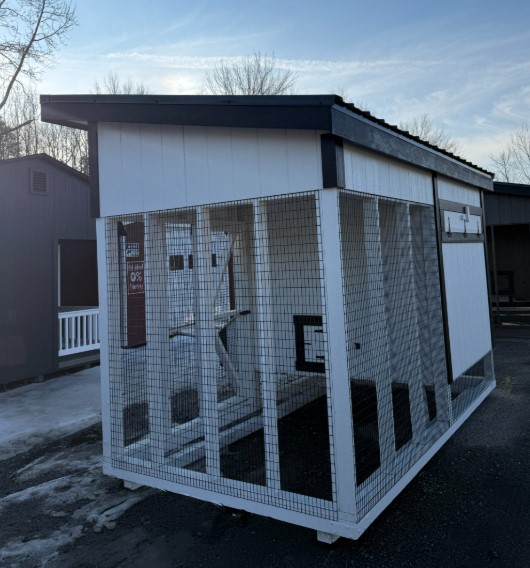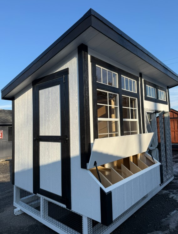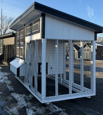 Built with expert Amish craftsmanship, this 7×12 Lean-To Chicken Coop combines durability with bold style. Finished in rich White with Black trim and a Black Metal roof, it offers a sleek, modern look. LP® Smart Panel siding provides long-lasting strength and weather resistance. Upgraded epoxy flooring ensures easy cleaning and low maintenance, while tar paper adds an extra moisture barrier for protection. A convenient clean-out lid makes upkeep simple and efficient. Spacious, sturdy, and thoughtfully designed, this premium coop delivers comfort for your flock and lasting value for your property.