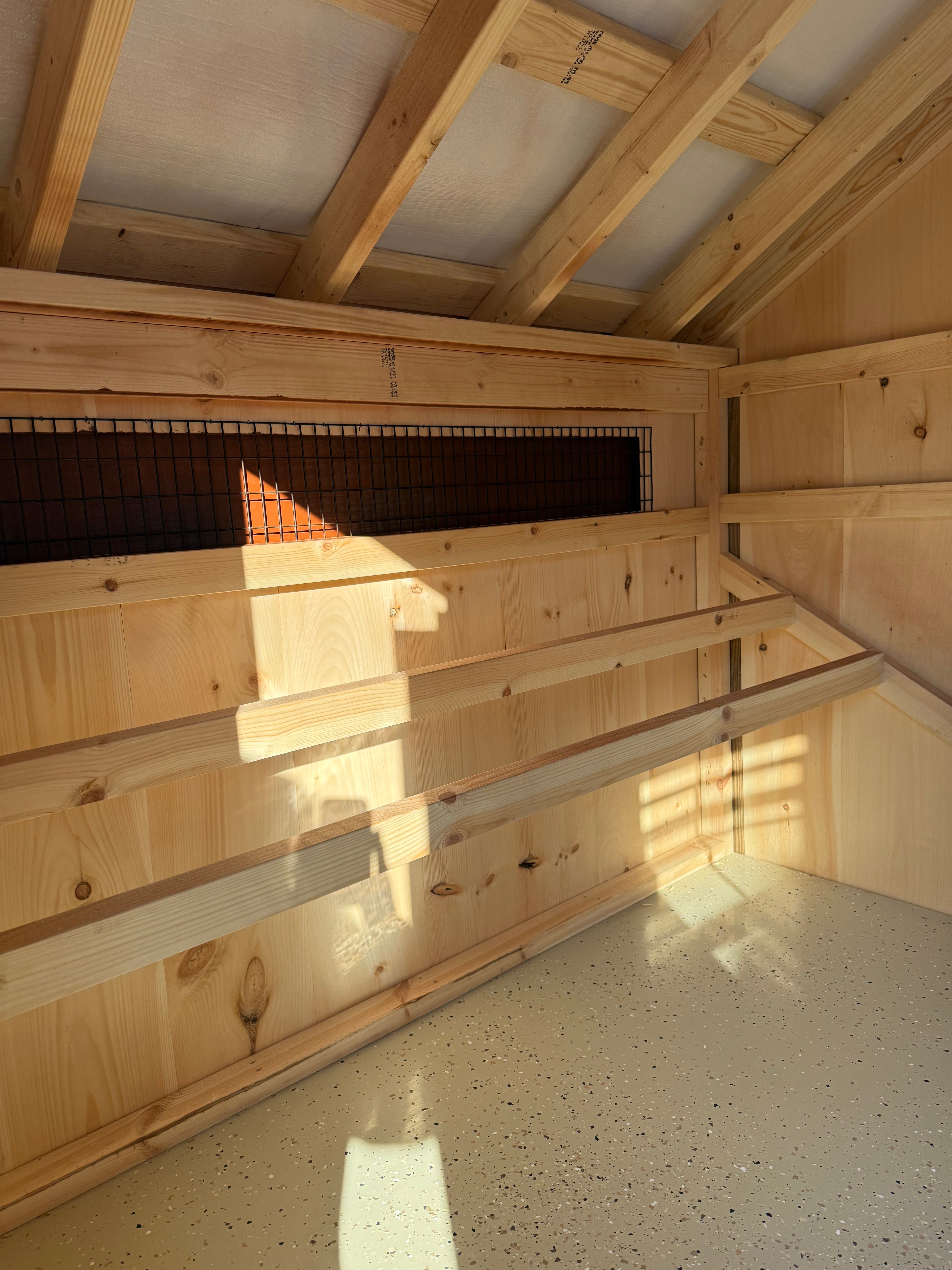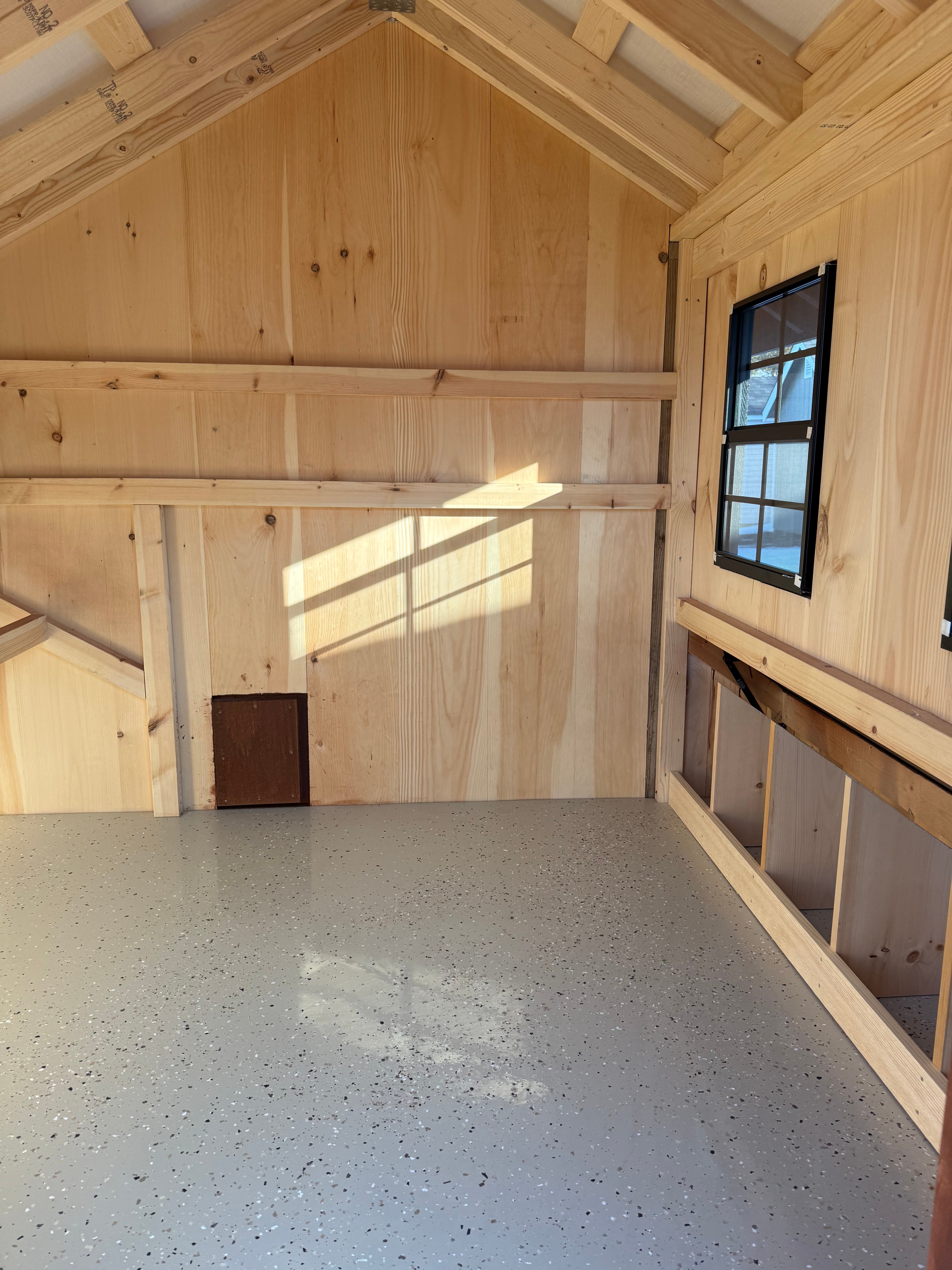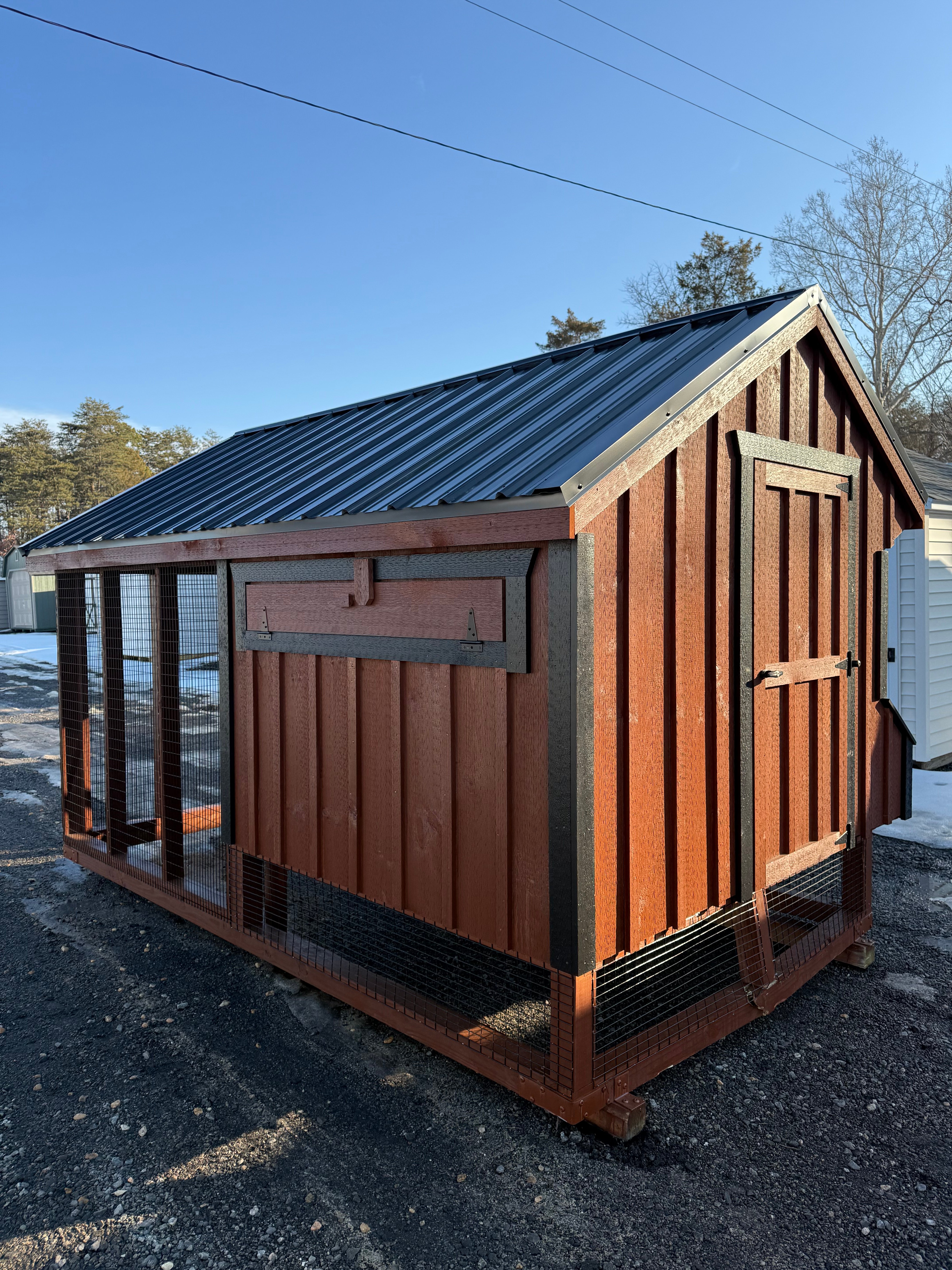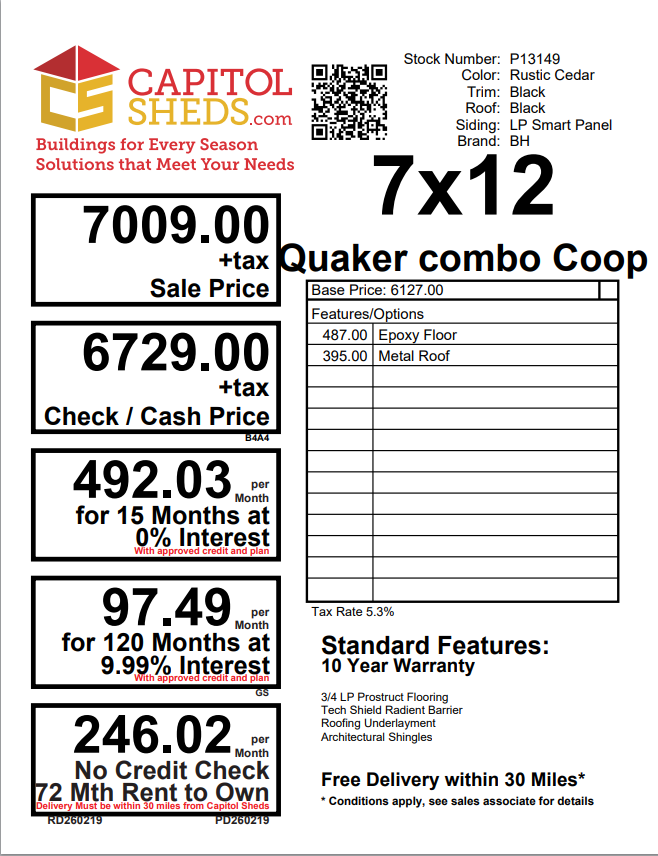 Bring charm and functionality to your backyard with this Amish-built 7×12 Quaker Combo Chicken Coop. Finished in warm Rustic Cedar with bold black trim and a sleek black metal roof, it’s as stylish as it is durable. LP Smart Panel siding ensures long-lasting performance, while the upgraded epoxy floor offers easy cleaning and superior protection. Thoughtfully crafted for both storage and poultry care, this coop combines timeless design with rugged construction—perfect for homesteaders who want beauty, durability, and practicality in one smart structure.