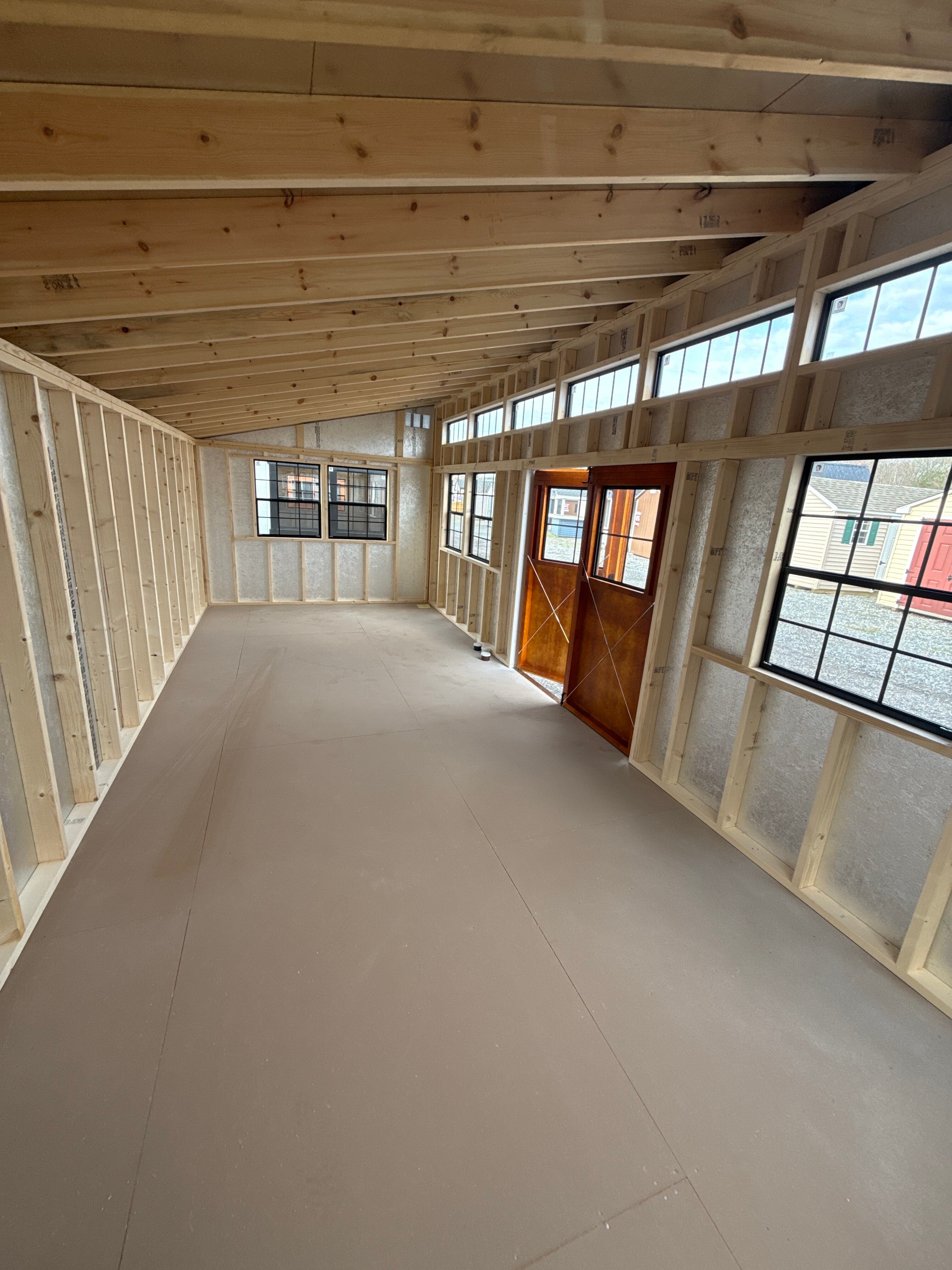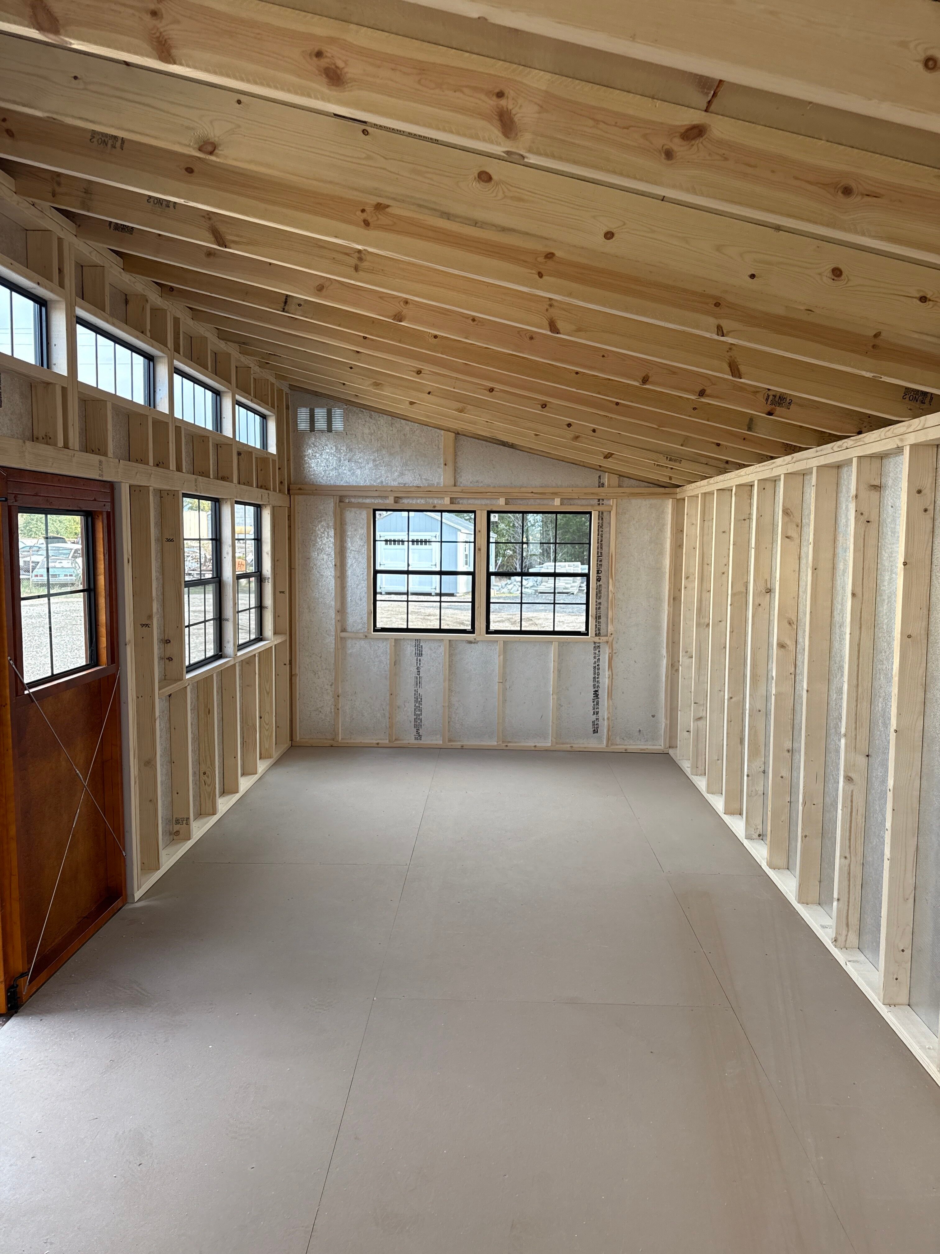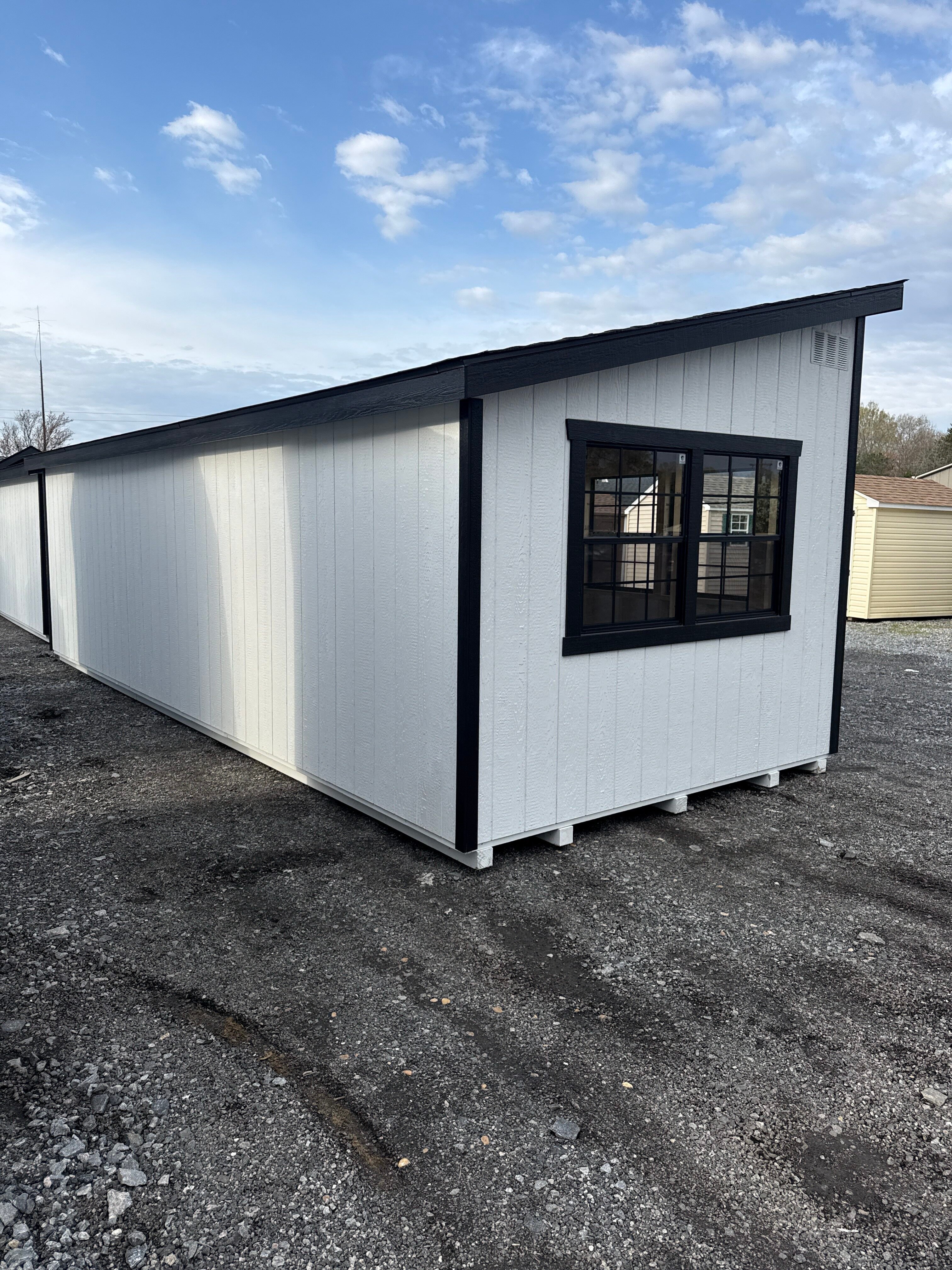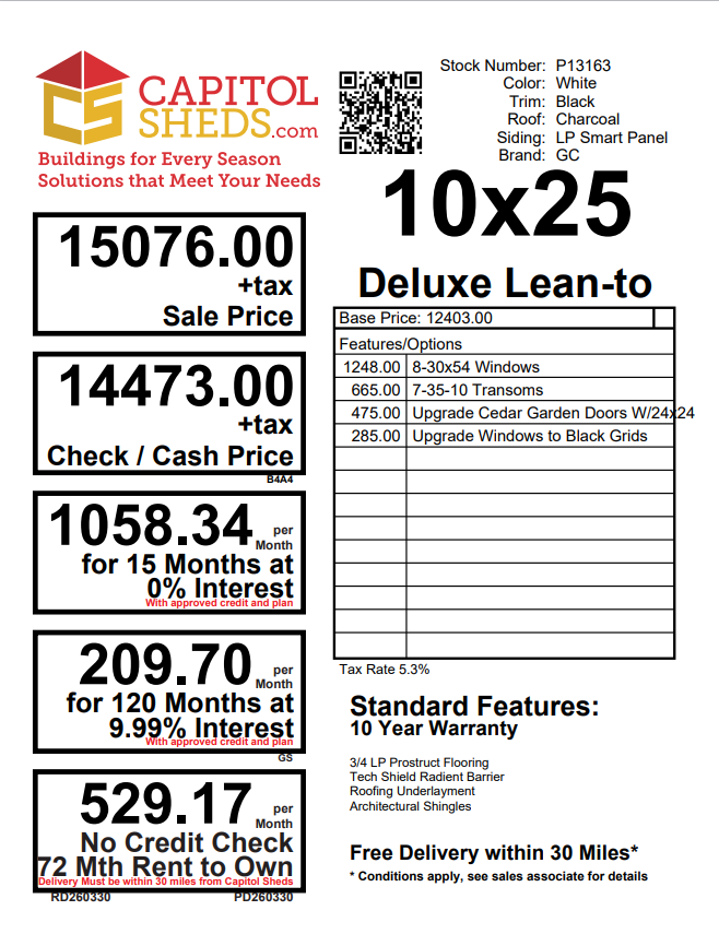 The 10×25 Deluxe Lean-to delivers modern sophistication with premium construction and exceptional natural light. Finished in White LP SmartPanel siding with Silverbacker, contrasted by Black trim and a Charcoal architectural shingle roof, it offers a crisp, contemporary aesthetic. Built with 2×4 wall and roof framing 16″ on center, LP Tech Shield roof sheeting, LP ProStruct flooring, and pressure-treated joists, this structure is engineered for long-term durability. Upgrades include black 30×54 windows, striking 35×10 black transom windows, and a Cedar garden door with black windows, creating a bright, refined space ideal for studio, storage, or backyard retreat use.