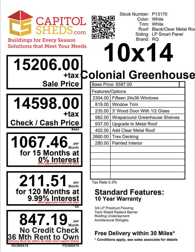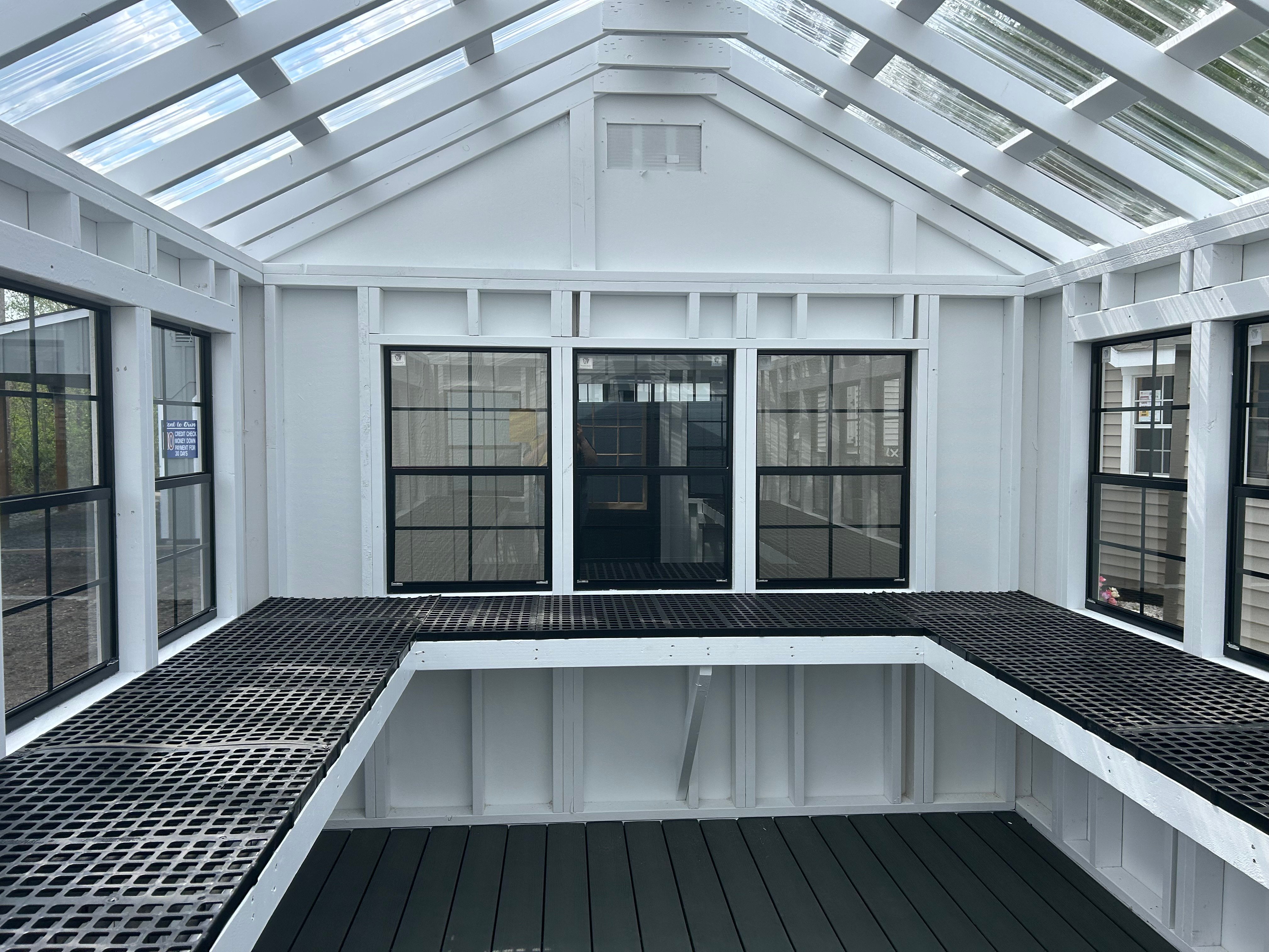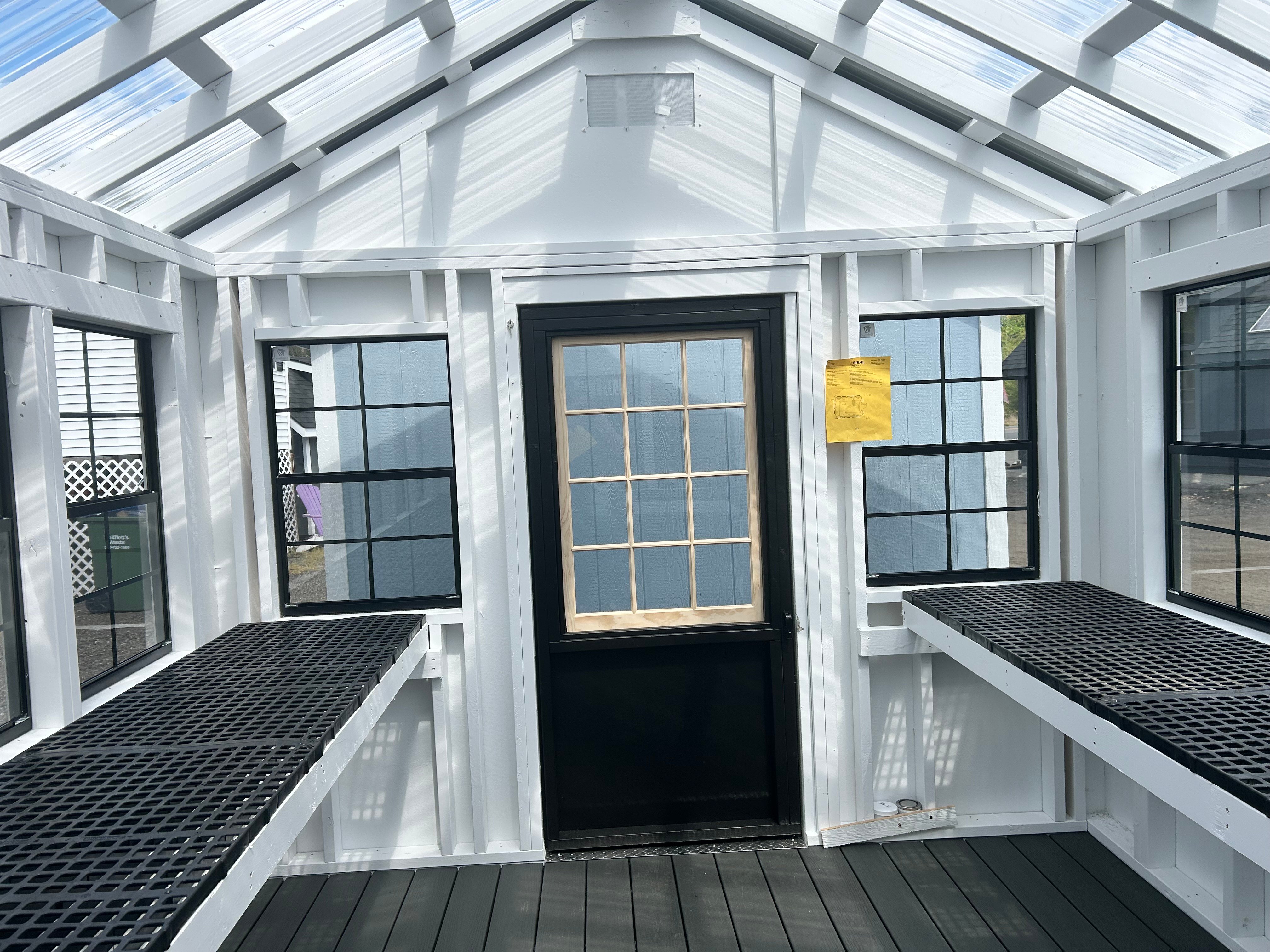 Style Name: Colonial Greenhouse Size: 10 by 14 Siding: LP Smart Panel Main Color: White Trim Color: White Roof Color: Black and Clear Metal Roofing: Classic Ribbed Metal Number of Windows: 15 Number of Doors: 1 Included Upgrades: Trex Deck with Spacers for Drainage 3′ Wood Door with 1/2 Glass Painted Interior Fifteen 24×36 Windows Clear Metal Roof Upgrades Wrap-around Greenhouse Shelves