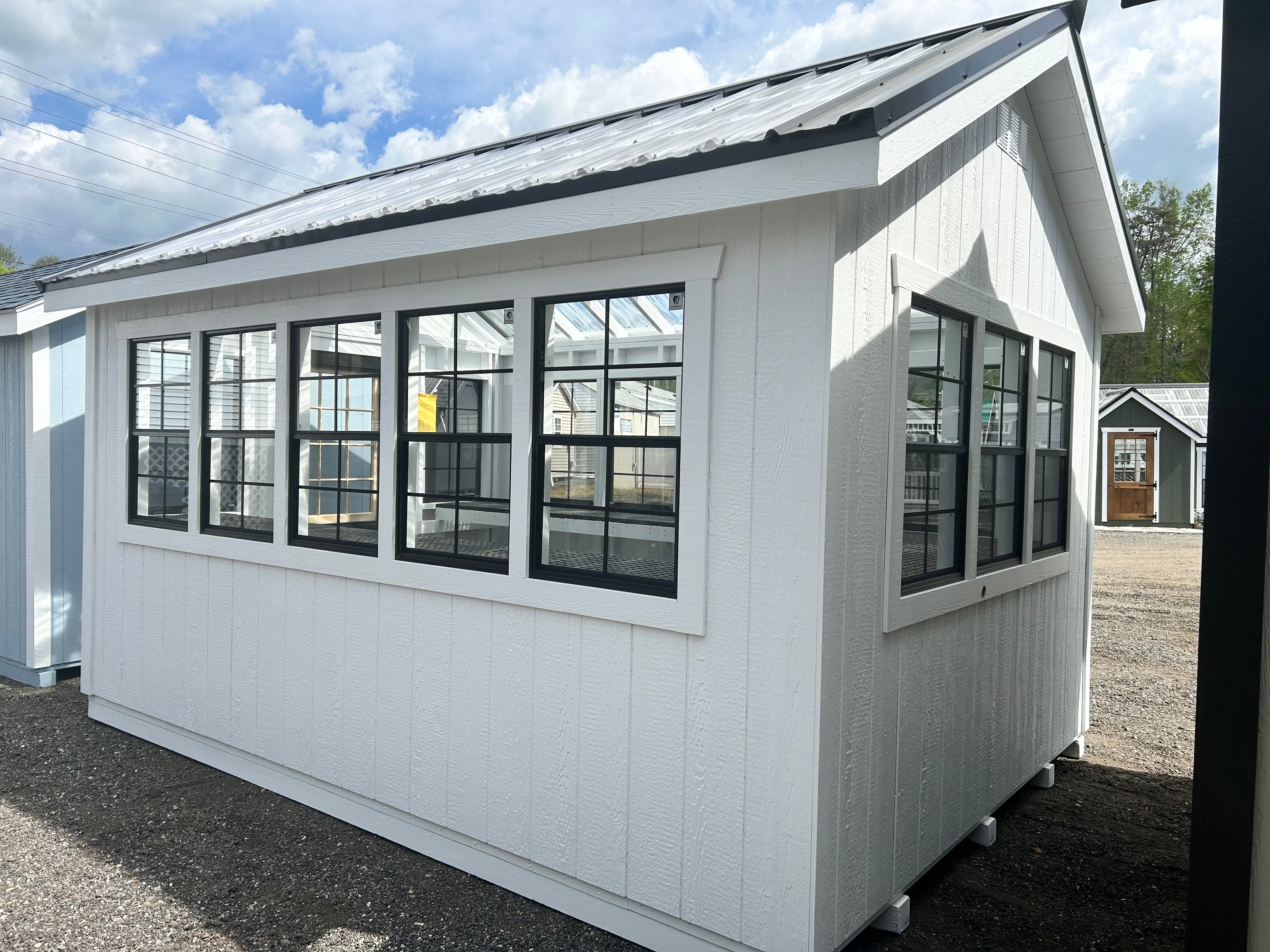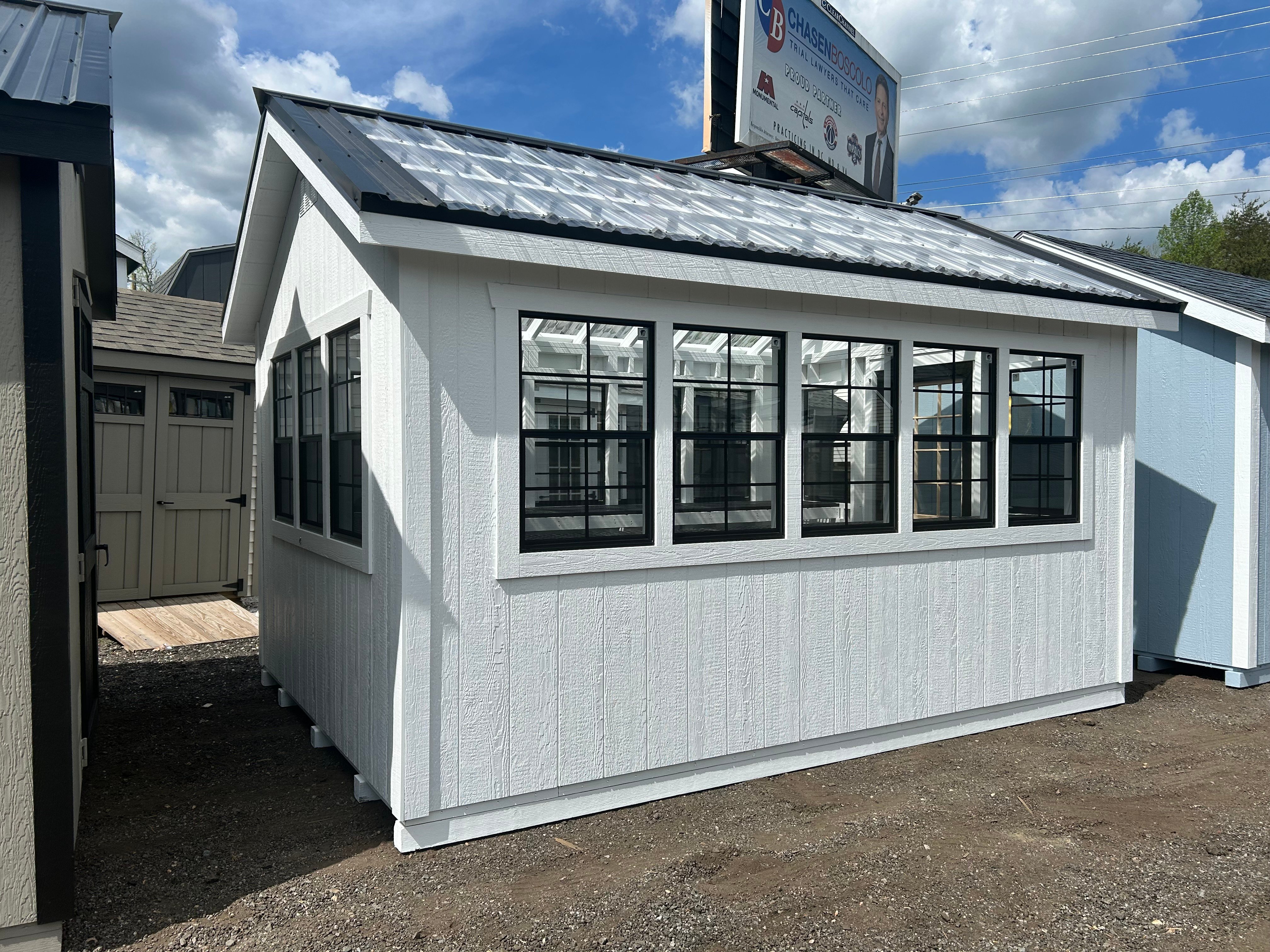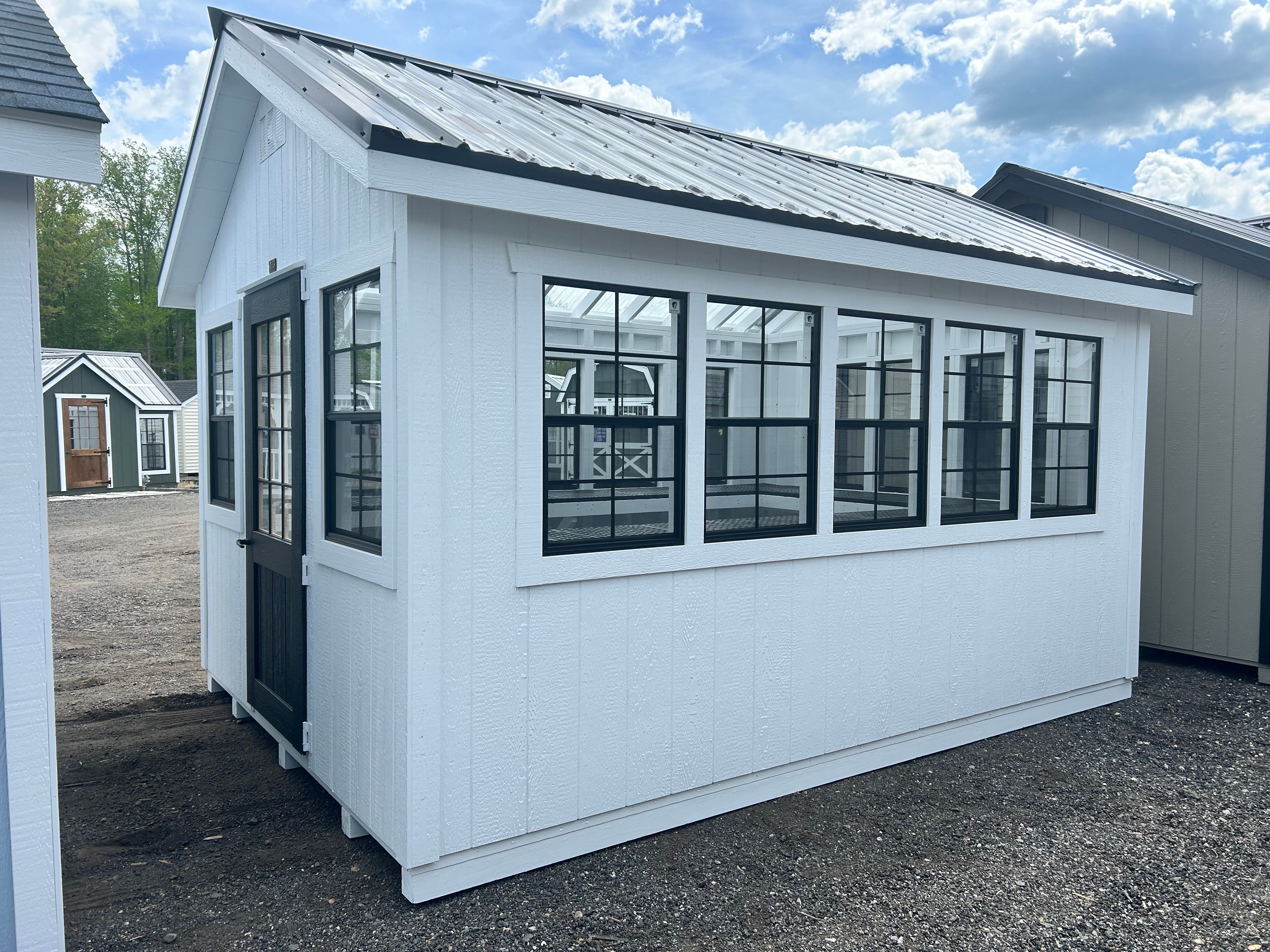 Style Name: Colonial Greenhouse Size: 10 by 14 Siding: LP Smart Panel Main Color: White Trim Color: White Roof Color: Black and Clear Metal Roofing: Classic Ribbed Metal Number of Windows: 15 Number of Doors: 1 Included Upgrades: Trex Deck with Spacers for Drainage 3′ Wood Door with 1/2 Glass Painted Interior Fifteen 24×36 Windows Clear Metal Roof Upgrades Wrap-around Greenhouse Shelves