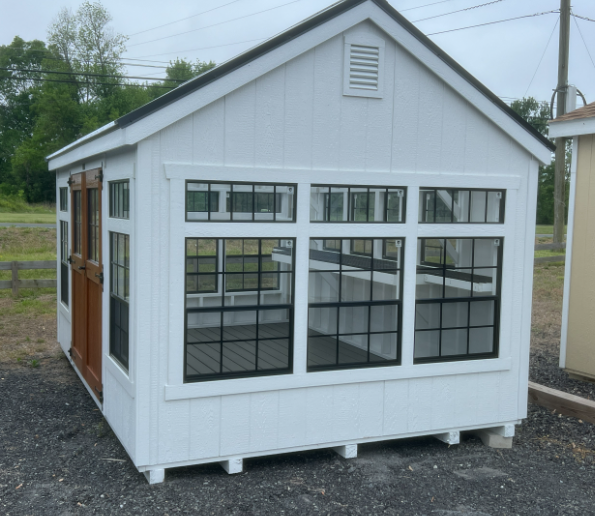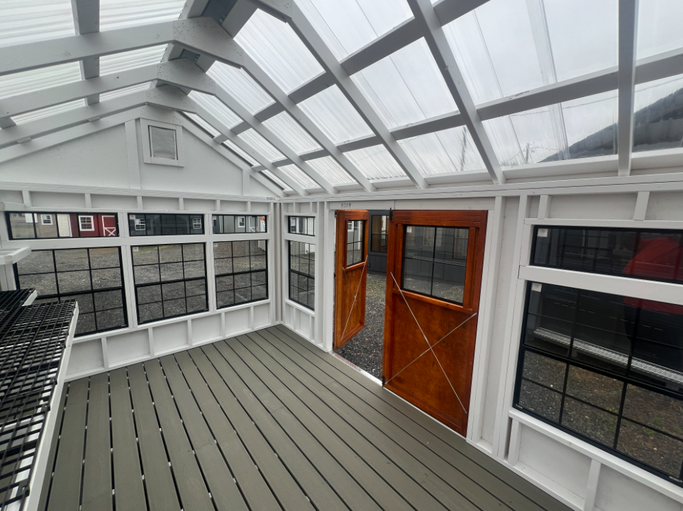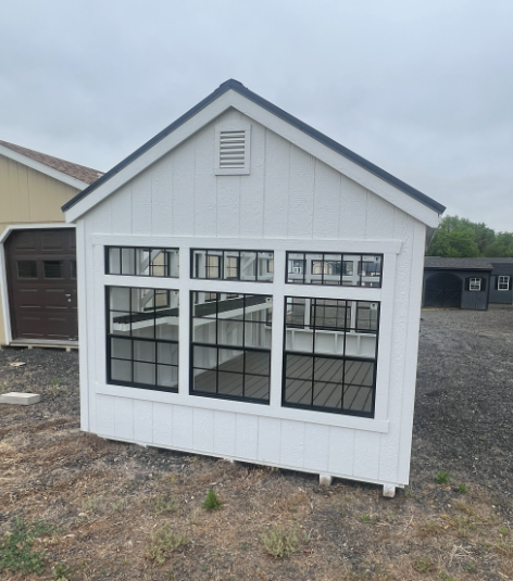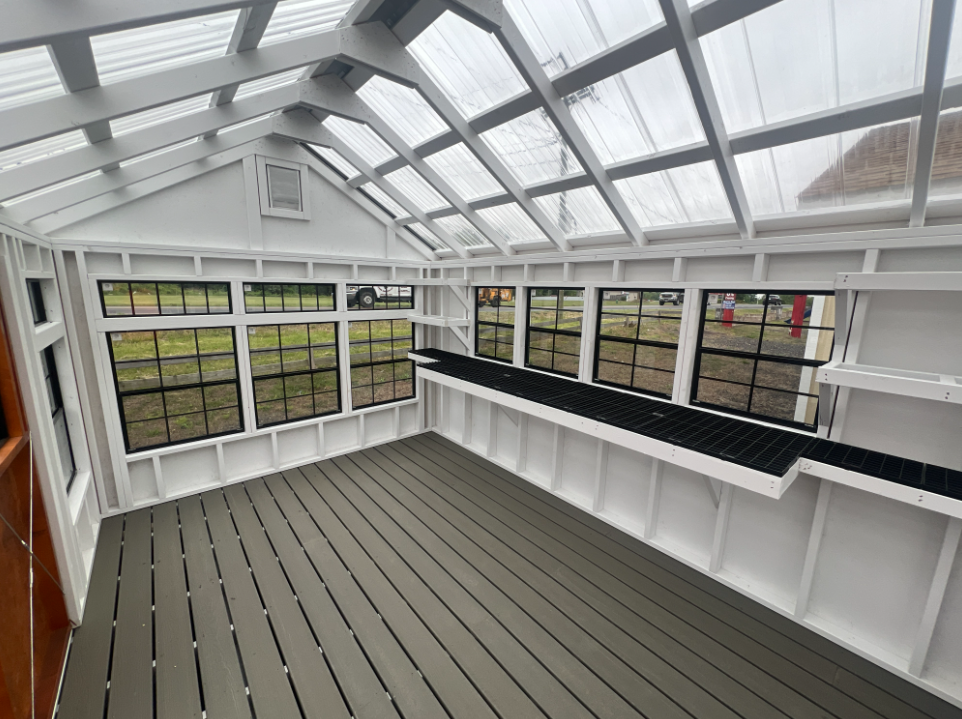 The 10×14 Garden Greenhouse combines functionality and style for serious gardeners. Featuring clean white LP Smart Panel siding with white trim and a clear metal roof, it maximizes sunlight while protecting plants. Constructed with 2×4 studs and rafters on 16-inch centers, and Evergrain decking over pressure-treated 2×4 joists, it’s built for durability. Twelve windows and double doors with transoms ensure light and ventilation. Additional upgrades include 24×27 and 30×36 windows, painted interior, a 10-foot garden shelf, additional 16-inch shelves, and upgraded garden vents. Perfect for year-round plant care, propagation, and organized gardening projects.