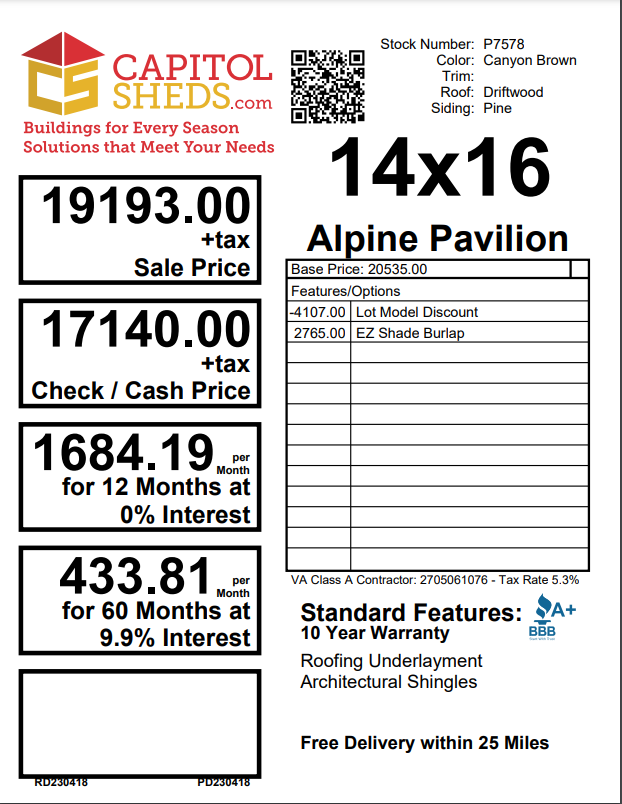 Reserve this building for a $500 deposit. Within 1 business day a rep will contact you to discuss delivery and discounts you may qualify for such as cash/check, military/1st responder, etc.