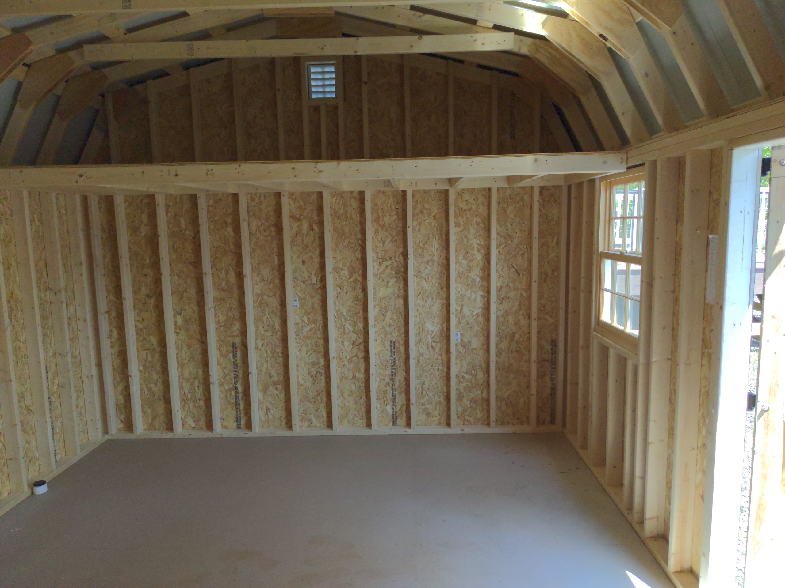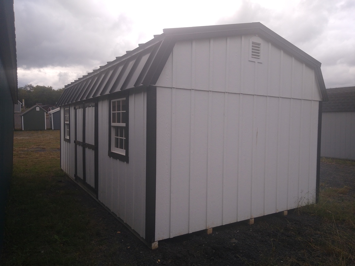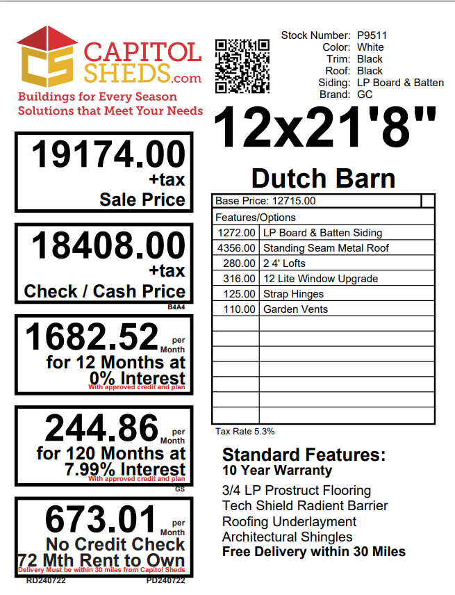 Introducing the Dutch Barn Storage Shed, meticulously crafted by Amish artisans. This 12×21’8″ shed features durable LP Smart Board & Batten siding in a timeless White hue, accented by crisp Black trim. The Black-colored roof with standing seam metal adds a touch of elegance. Two lofts for added storage space. With two windows and a double door, accessing your belongings is a breeze. The solid construction includes 2×4 studs for the walls and 2×4 rafters for the roof, ensuring durability. Elevate your storage solution with the Amish-built Dutch Barn Storage Shed today.