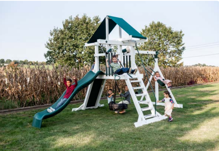 Introducing the Bright Star Playset: an Amish masterpiece crafted from vinyl wrapped Pressure Treated Southern Pine, sized 21’x25′. Features include a 6×8 Tower, 10′ Wonder Wave Slide, and a 4 swing beam with various swings.